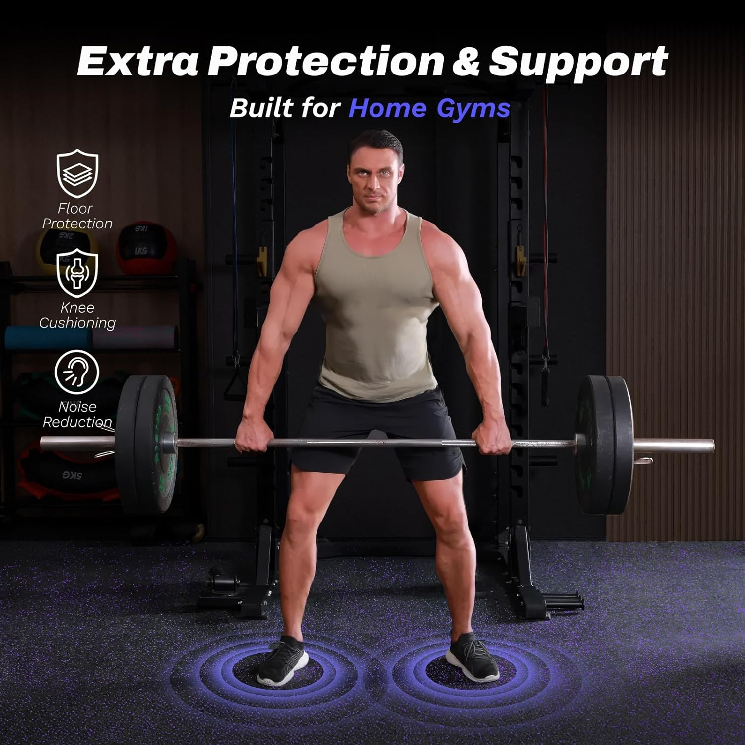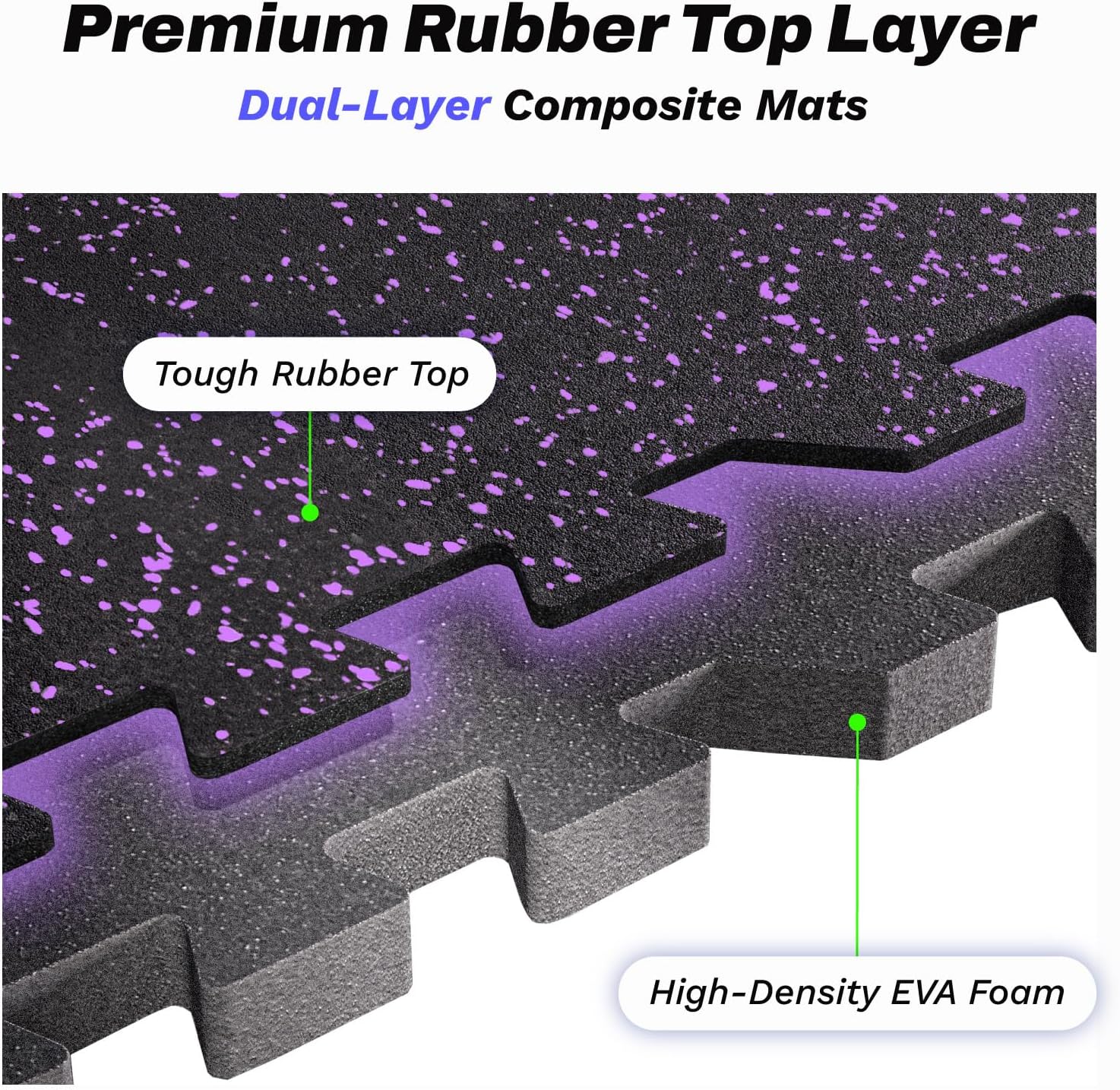 - [Upgraded Dual-Layer Design]: Concerned about your equipment scratching the floor during workouts? Our 2in1 Rubber Top EVA Foam Exercise Gym Mats are crafted to solve this issue. The textured rubber top layer, combined with a high-density EVA foam bottom layer, seamlessly creates a non-slip tough surface with excellent shock absorption.