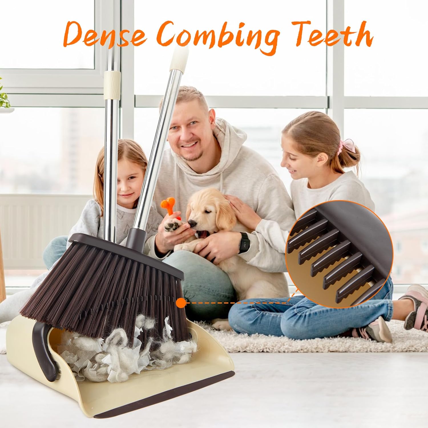 Broom and Dustpan Set, Dustpan Combo with 51" Stainless Steel Long Handle Brooms with 5-Layer Soft Bristles for Home Office Kitchen Bathroom(Beige)