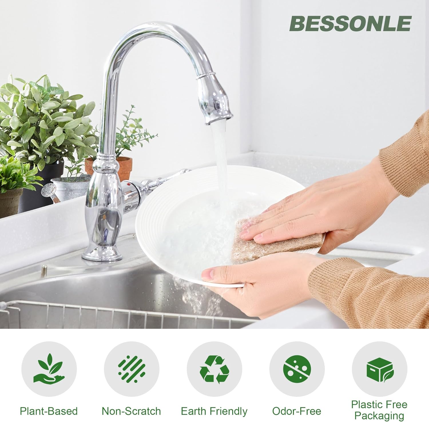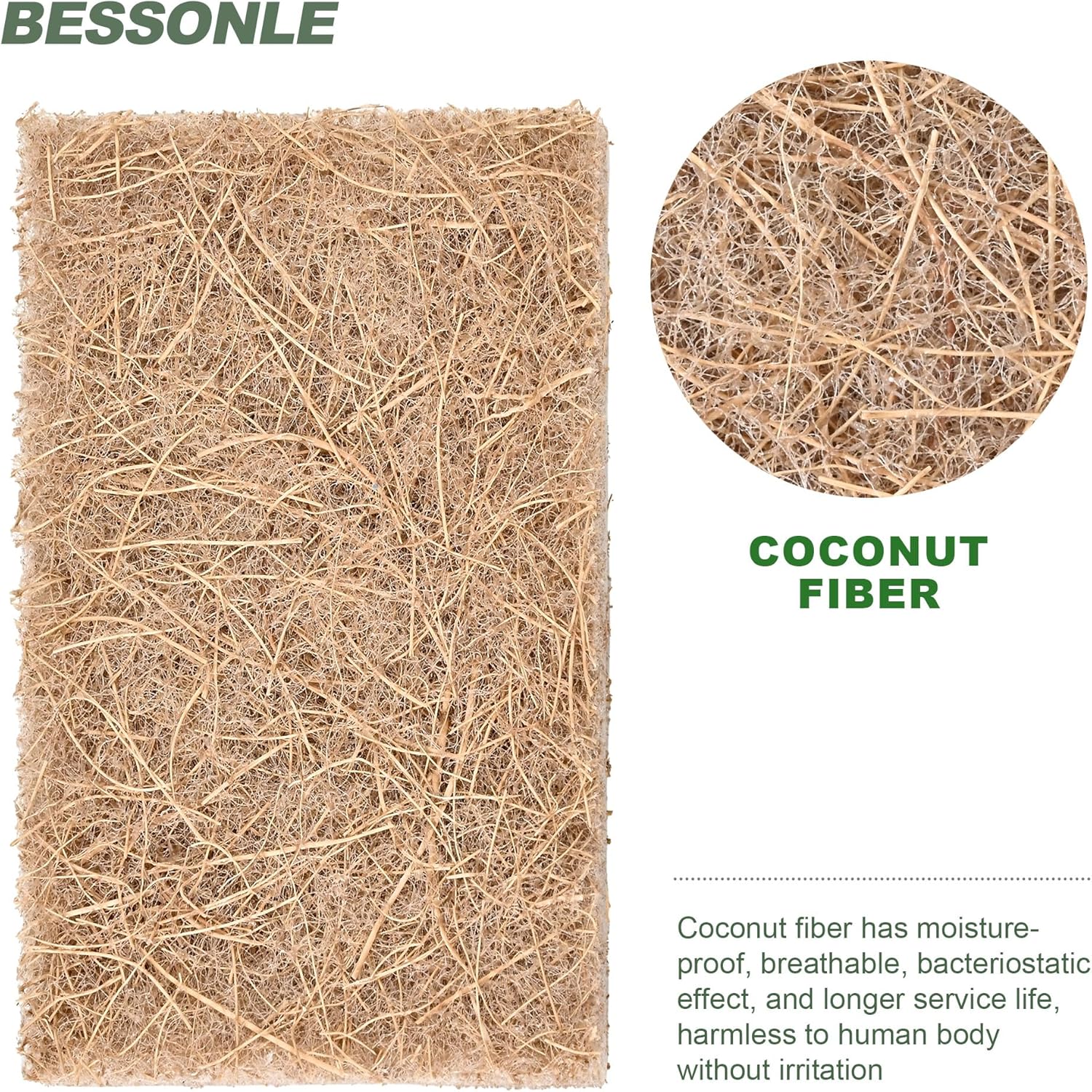 - NATURAL SCOURING PADS - BESSONLE's biodegradable heavy duty scour pad is made with coconut fibers binded together with recycled fibers for a mix of great cleaning performance and care for the environment(The box is also). This green scouring pad makes it easier than ever to go green in the kitchen!