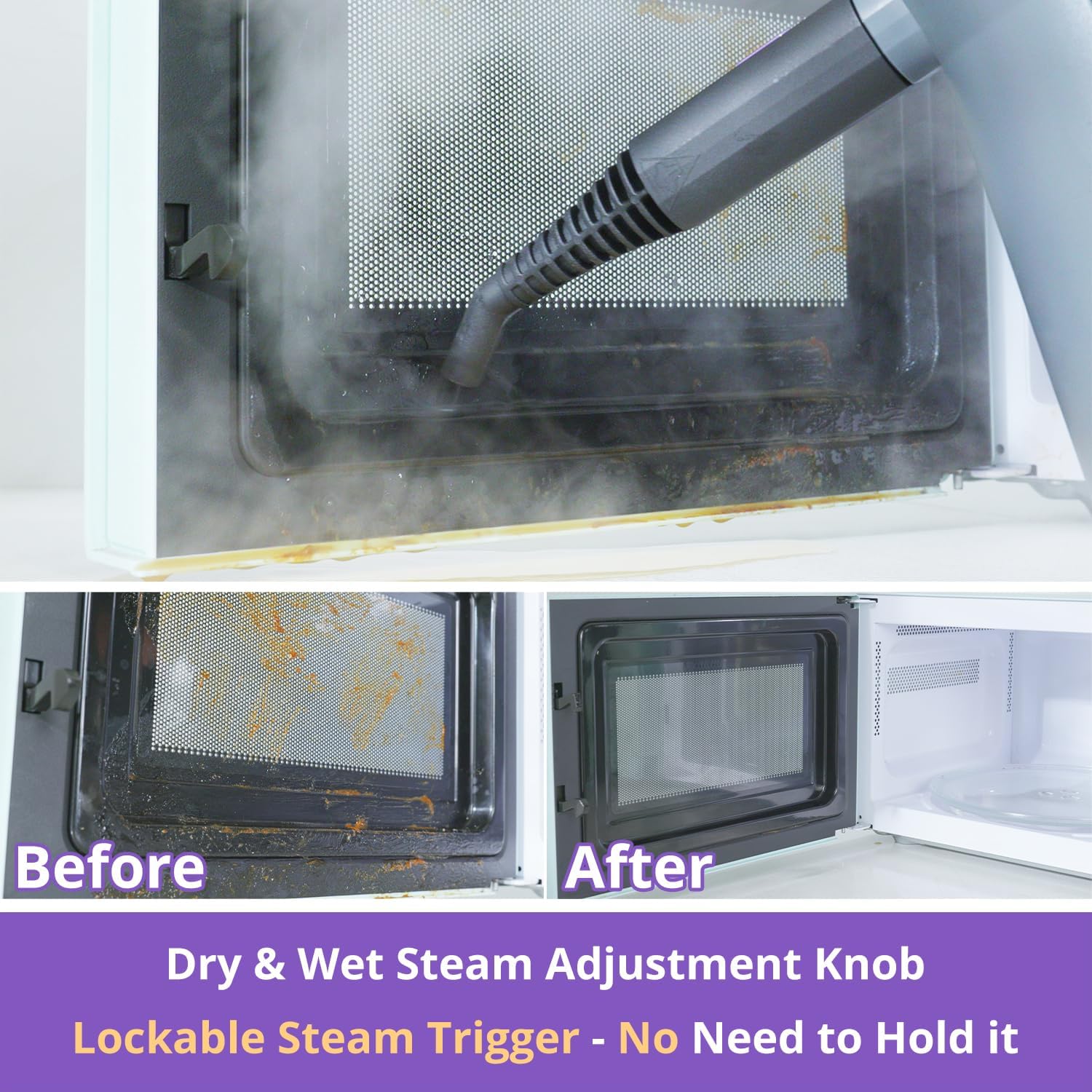 - [Efficient Operation]: Generates steam in just 10 seconds and The water tank remains non-pressurized and unheated during operation, allowing for immediate refills without waiting for the unit to cool down. Enjoy uninterrupted cleaning sessions—refill anytime safely and conveniently, saving time and effort. It is the ideal choice for cleaning sofa, mattress, spot detail, fabric surface, kitchen, bathroom, bed, window, curtain, shower, oven, grill, and removing wallpaper from wall.