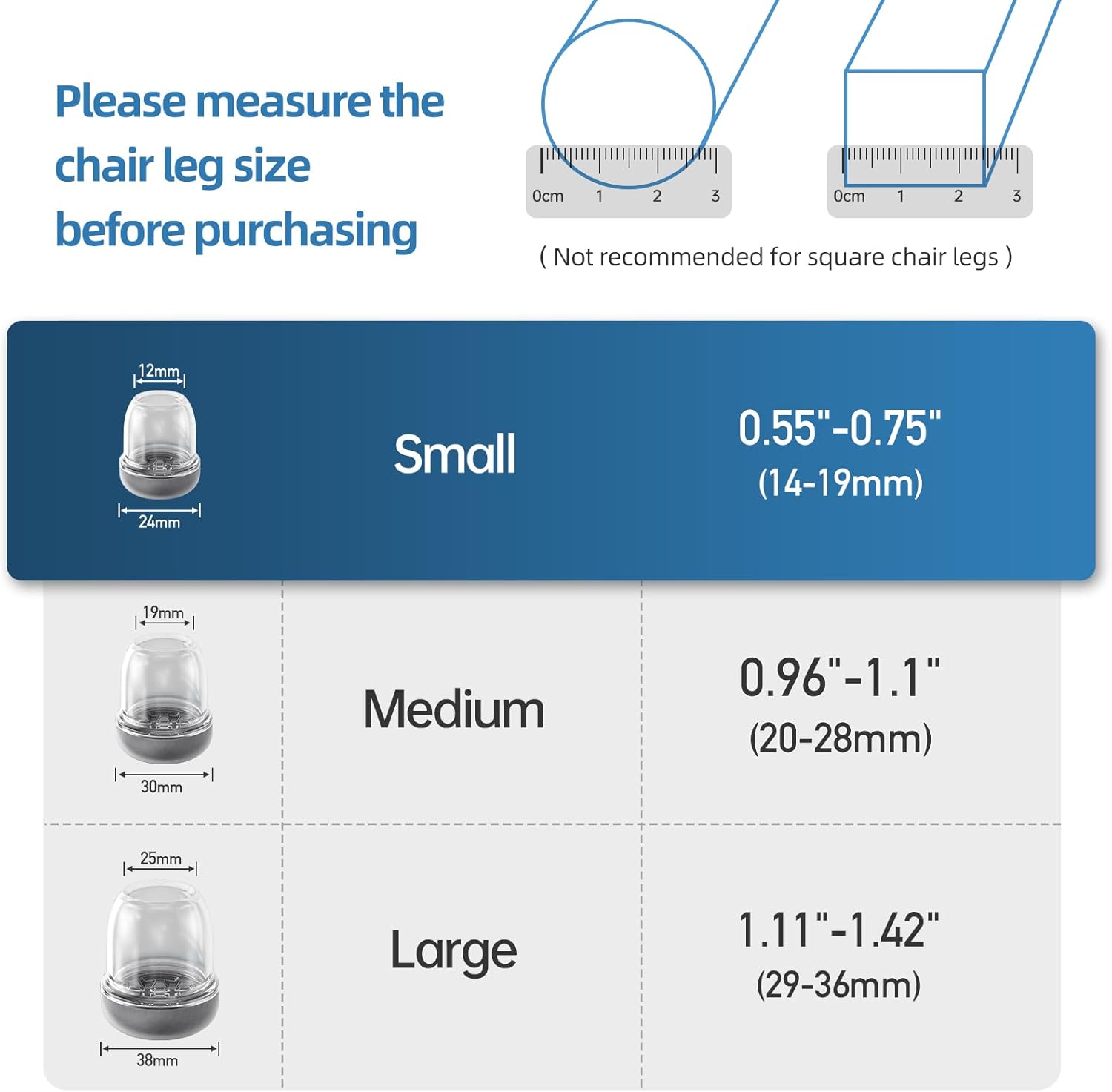 - [Multiple size options] Chair Leg Caps are elastic and can better adapt and fit the chair legs. We have three sizes (suitable chair leg diameter/side length: 0.63''-0.79''16-20mm ,0.83''-1.02''21-26mm ,1.10''-1.30''28-33mm) Warm reminder: Please carefully measure the diameter of the chair legs before ordering.