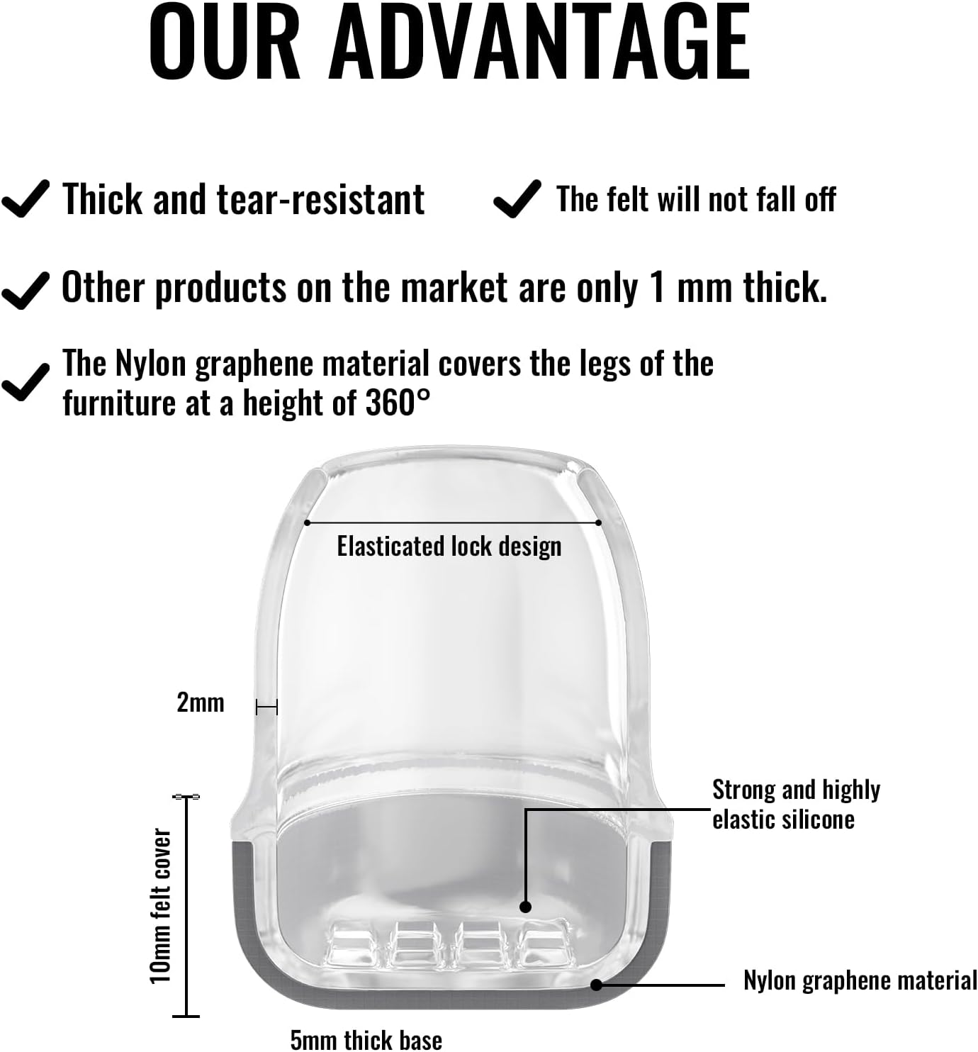 - [Protect the floor from scratches and noise-free]: Our Chair Leg Caps have upgraded the Nylon graphene cloth Pads at the bottom to make it more resistant to friction, protect the floor from scratches and greatly reduce noise, creating a quiet living environment and improving the quality of life.