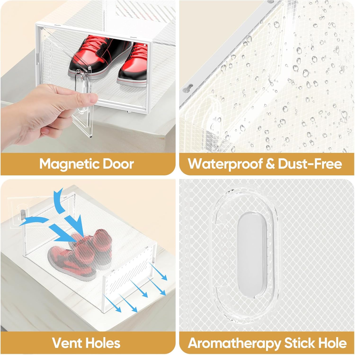 - Upgrade Version: Larger Space + Magnetic Door + Ventilation Holes + Aromatherapy Stick Hole + Thickened Material. This shoe box offers ample space for your shoes, along with a designated slot for an aromatherapy stick(not included). The door's magnetic closure provides a secure seal to prevent unintended opening