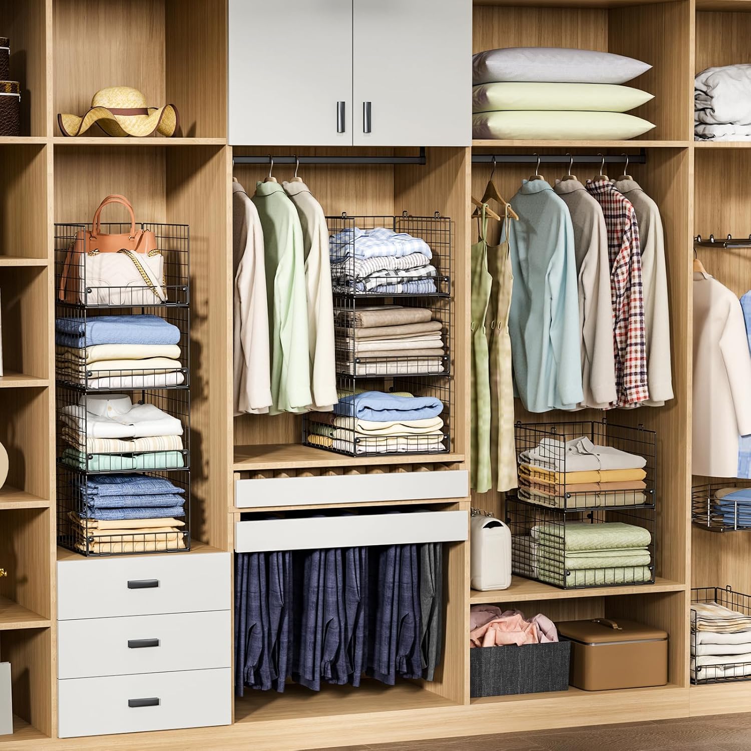 - 【Sturdy Iron Mesh】Made of premium iron mesh,these closet storage bins are sturdy,durable,breathable,visible,no smell and washable.Would not bend or damage like plastic or cloth storage baskets. You can count on it is strong enough and has a good craft.
