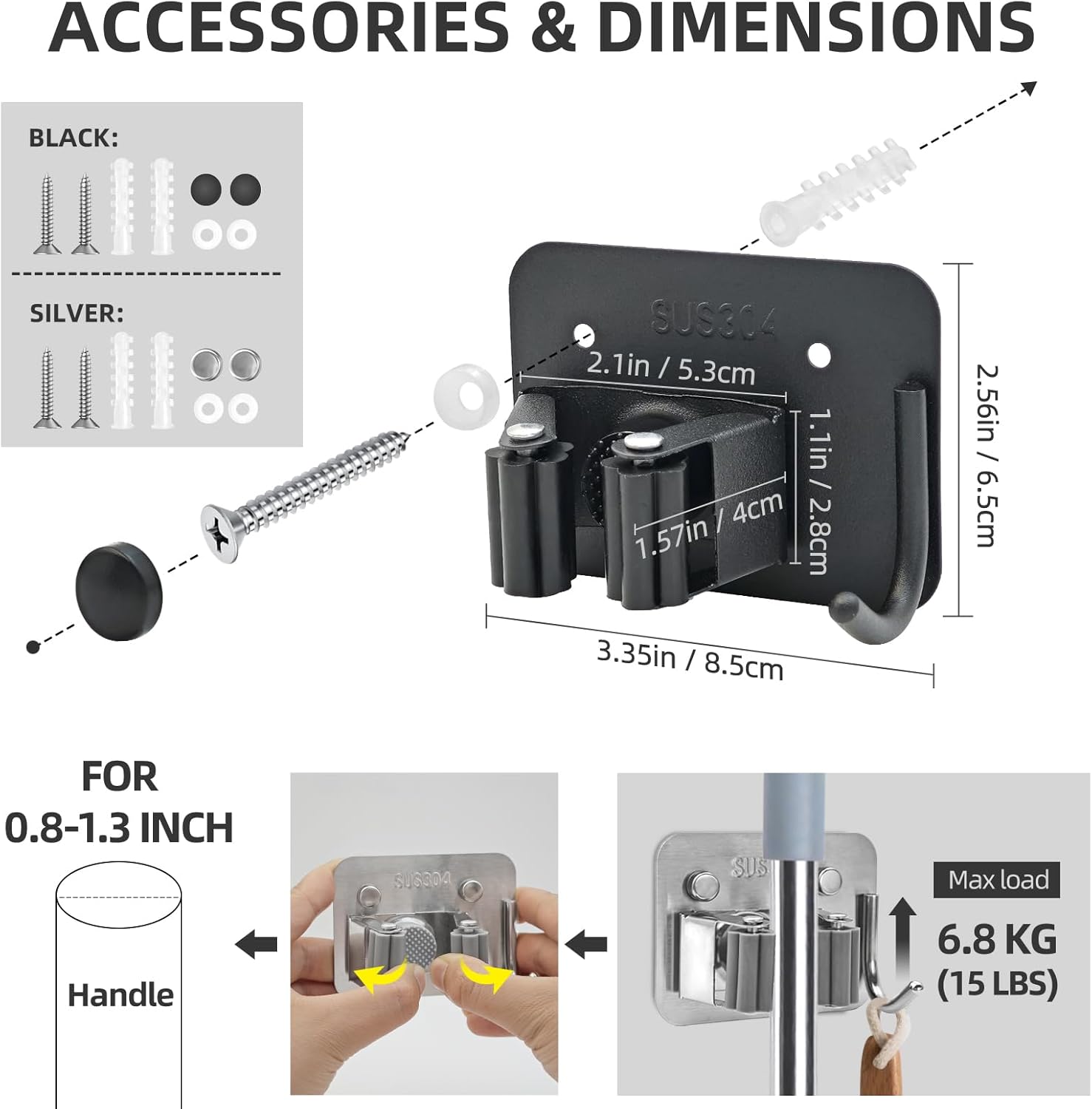 • šŸ§¹ć€Utility & Aesthetic怑Crafted from premium 304 stainless steel, this broom rack is durable and also rust-resistant. Our wall-mounted broom hooks can support an impressive weight of up to 15 pounds. In addition, each bracket is equipped with two screw decorative caps of the same color to ensure aesthetics. The sleek silver brushed and black frosted process designed to blend seamlessly into your space.