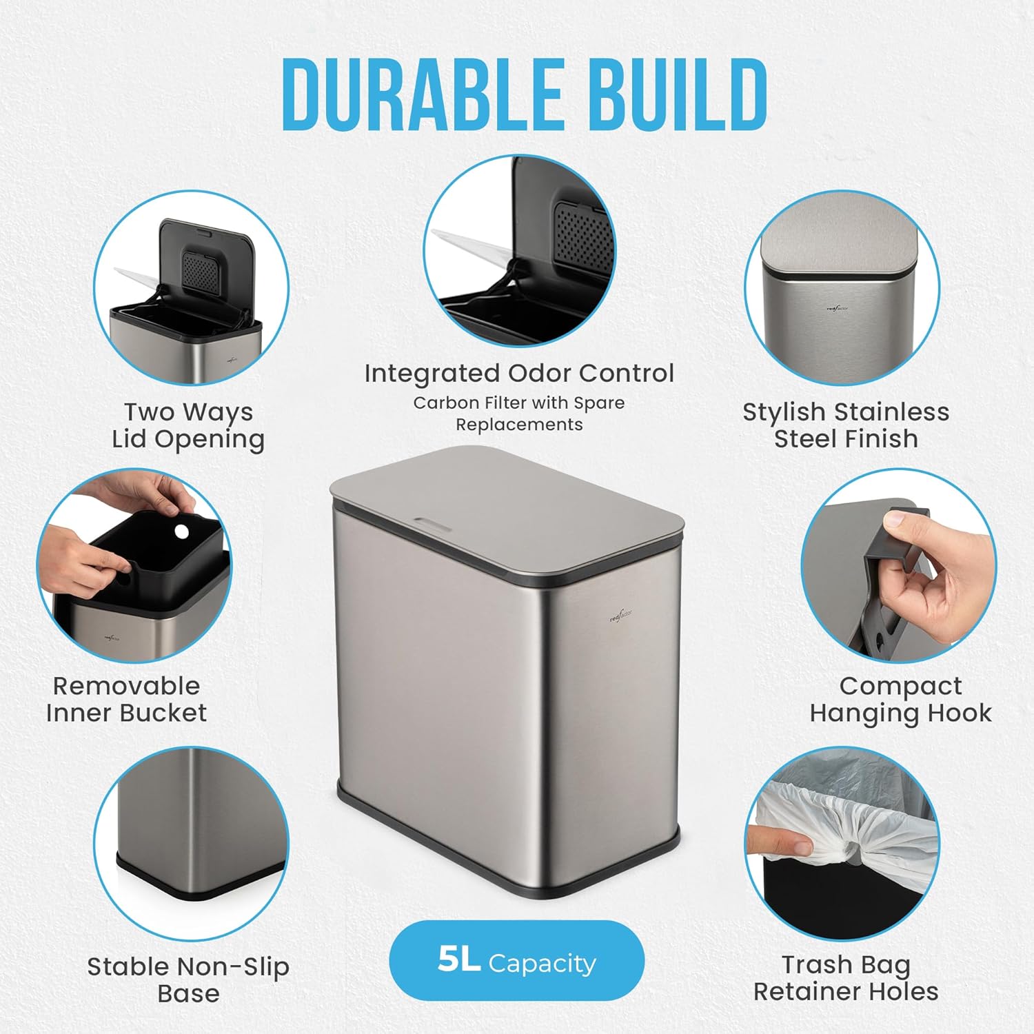 RedFactor Stainless Steel Hanging Trash Can with Lid and Inner Bucket – Slim 1.3 Gallon Odor-Free Compost Bin for Kitchen Cabinet, Countertop, Under Sink, or Bathroom (Metallic Gray)