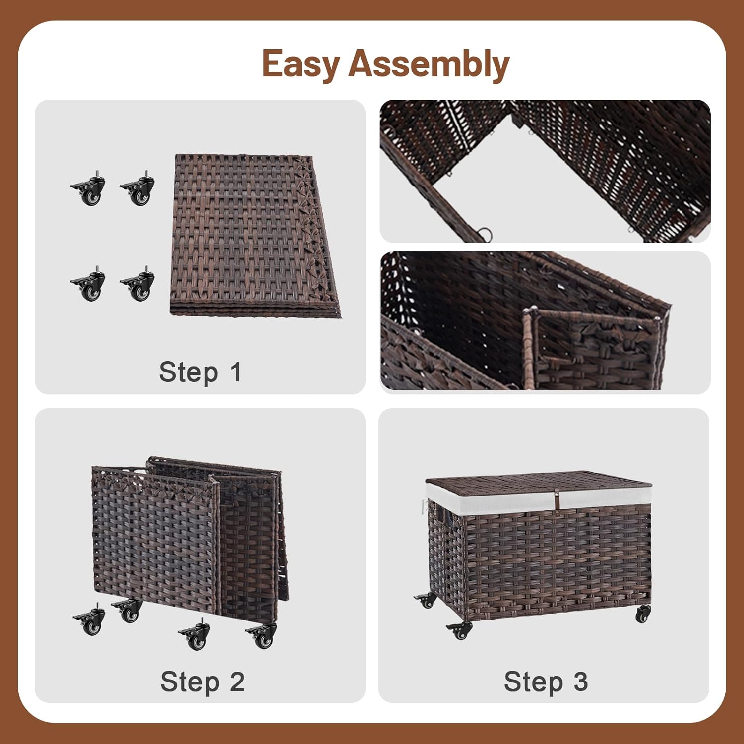Rolling Storage Basket with Lid, 47.6 Gallon (180L) Storage Bin with Wheels, Woven Rattan Blanket Storage Basket with Handles, Foldable, Metal Frame, Removable Liner for Bedroom, Laundry Room, Brown