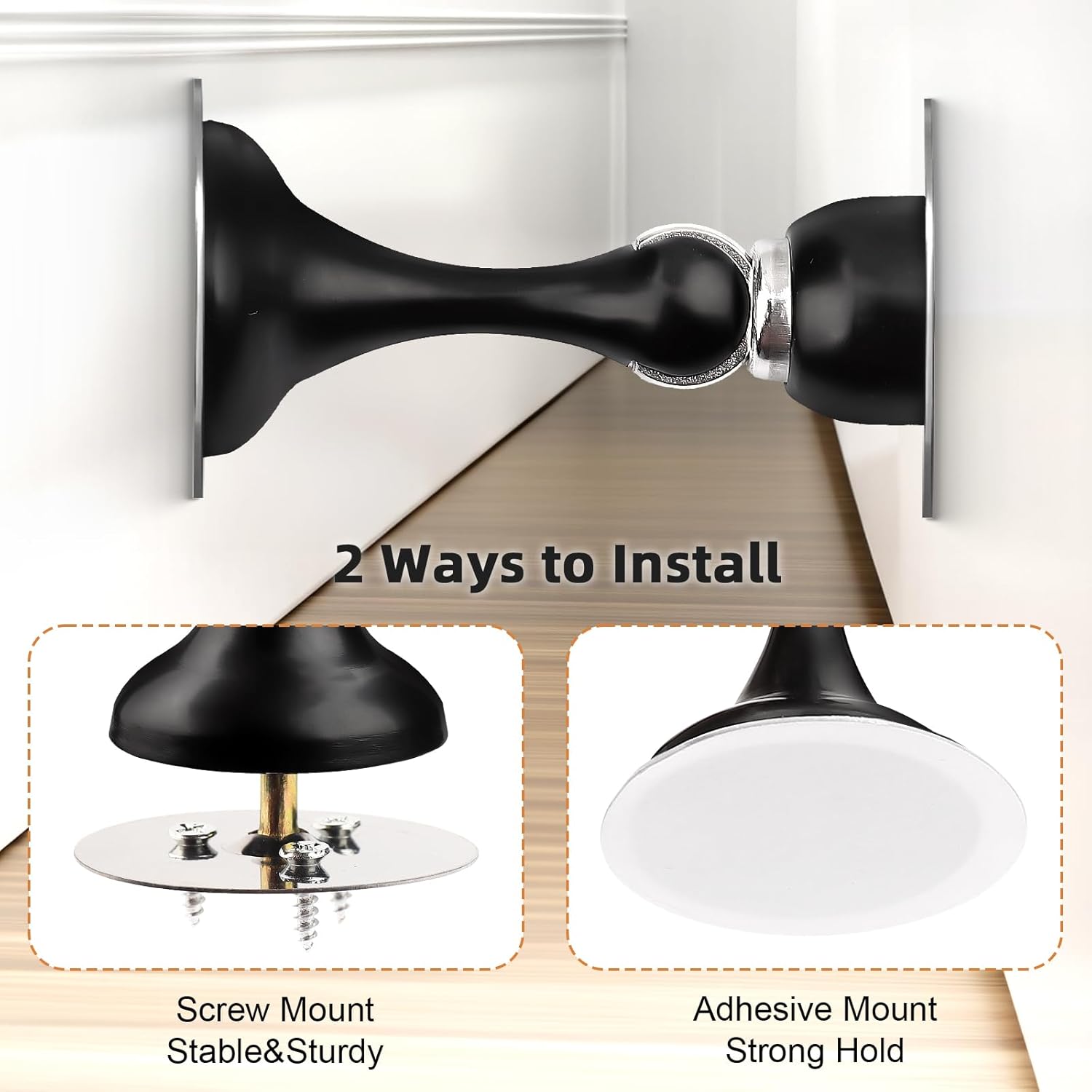 - [Easy Installation]: Door stops can be installed in two ways, drilling & non-drilling Installation. Use adhesive sticker without drilling, or mount permanently with screws. Package including: 2 door stoppers,4 mountings, 12 wood screws, 6 drywall anchors,6*3m tapes,2 bolt nuts and instruction book, easy to install
