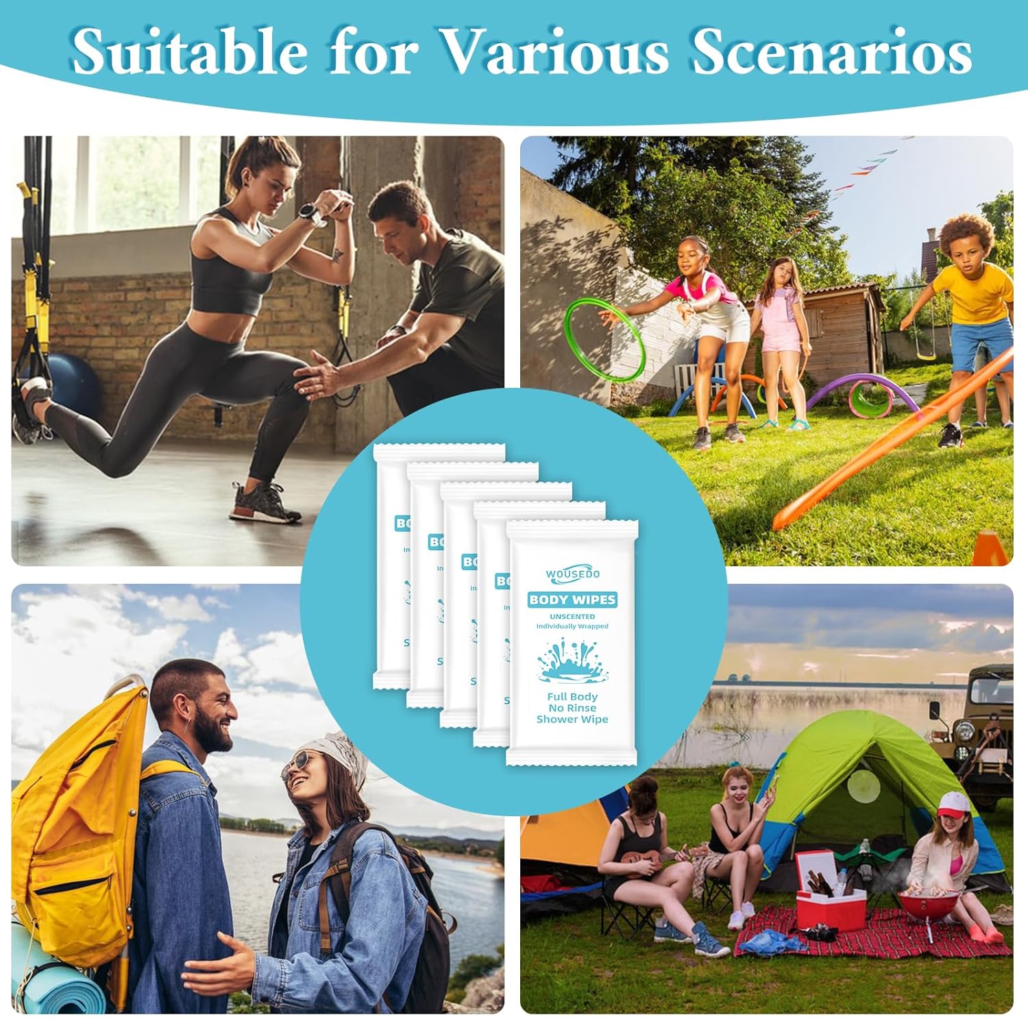 - Wide Applications: Our body wipes are suitable for all age groups and can be applied in a variety of scenarios. Whether you are traveling, camping, exercising, or just need a quick refreshment during the day, our shower wipes are always handy. They are a convenient and efficient cleaning solution that fits your active lifestyle, suitable for home, office, gym and other outdoor settings.