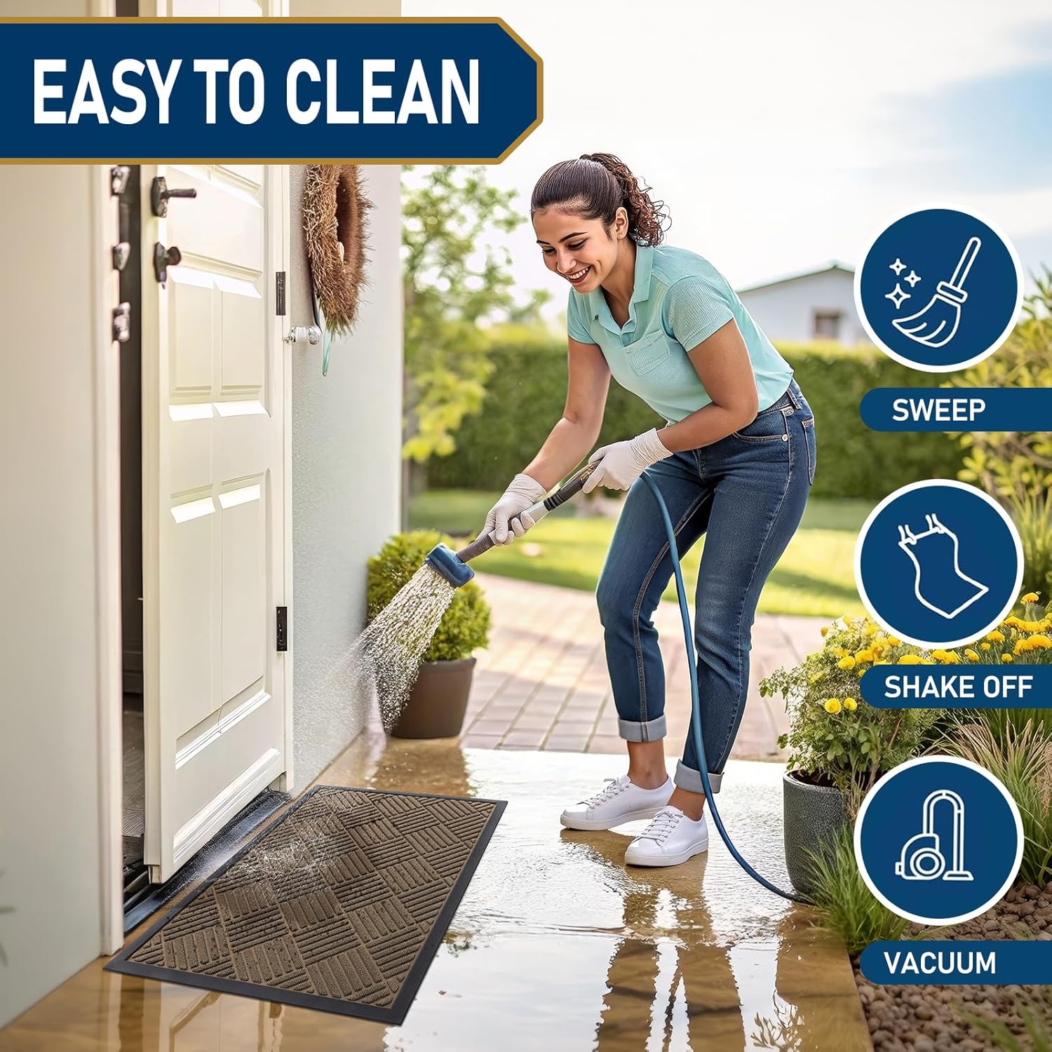 - Easy to Clean: Smiry front door mat can be swept with a broom, lifted by hand, or vacuumed. For a deeper cleaning, use a washing machine or hose to rinse, then hang it in a ventilated place to air-dry or tumble-dry. Do not use bleach or fabric softeners