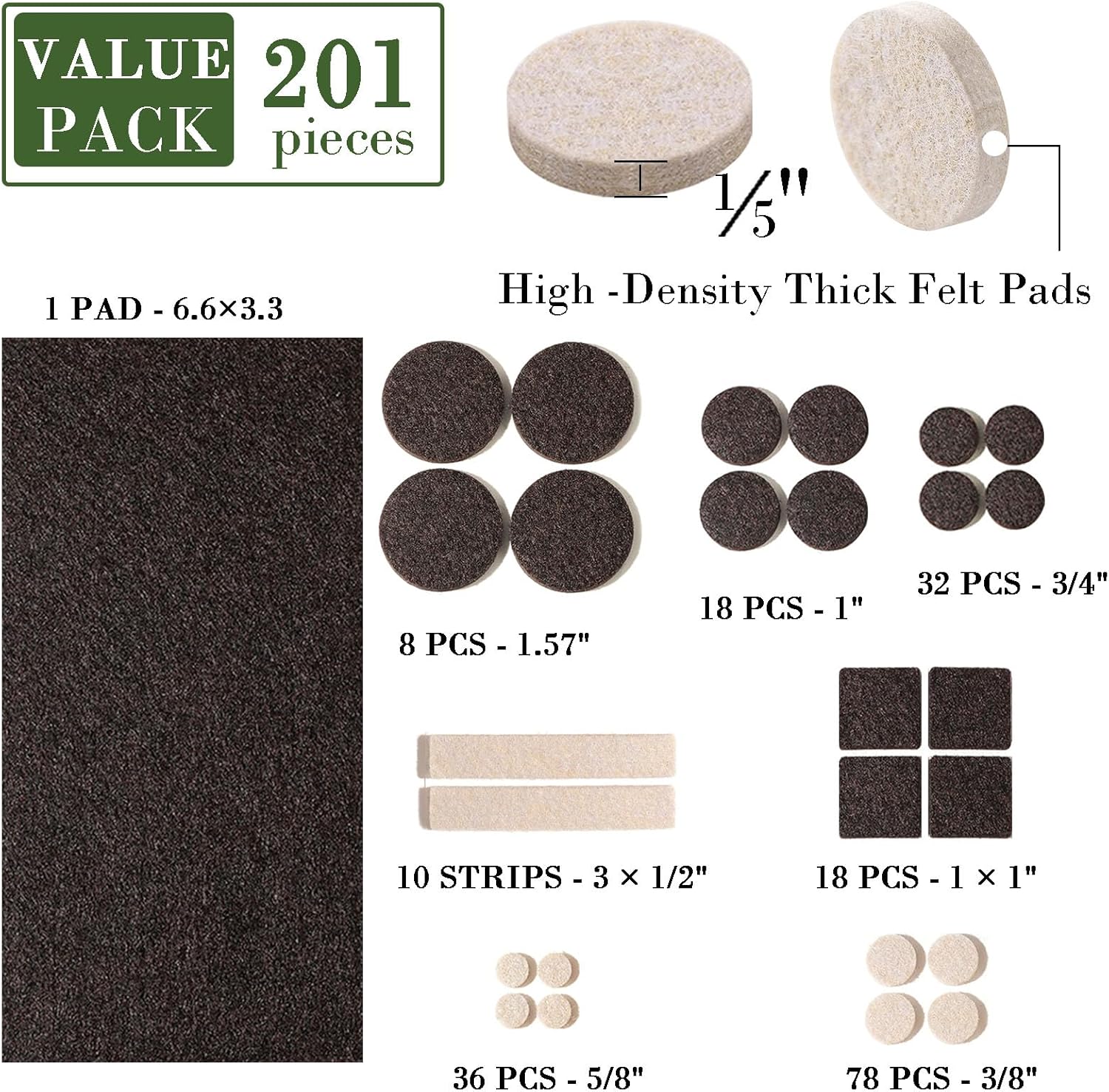 - 201 Pcs Felt Furniture Pads Includes: Round Felt Pads: (8) 1.57", (18) 1", (32) ¾", (78) 3/8", (36) 5/8", Strip Felt Pads: (10) 3"x1/2", Square Felt Pads: (1) 6.6×3.3", (18) 1×1", All sizes can be trimmed for use on different furniture legs.