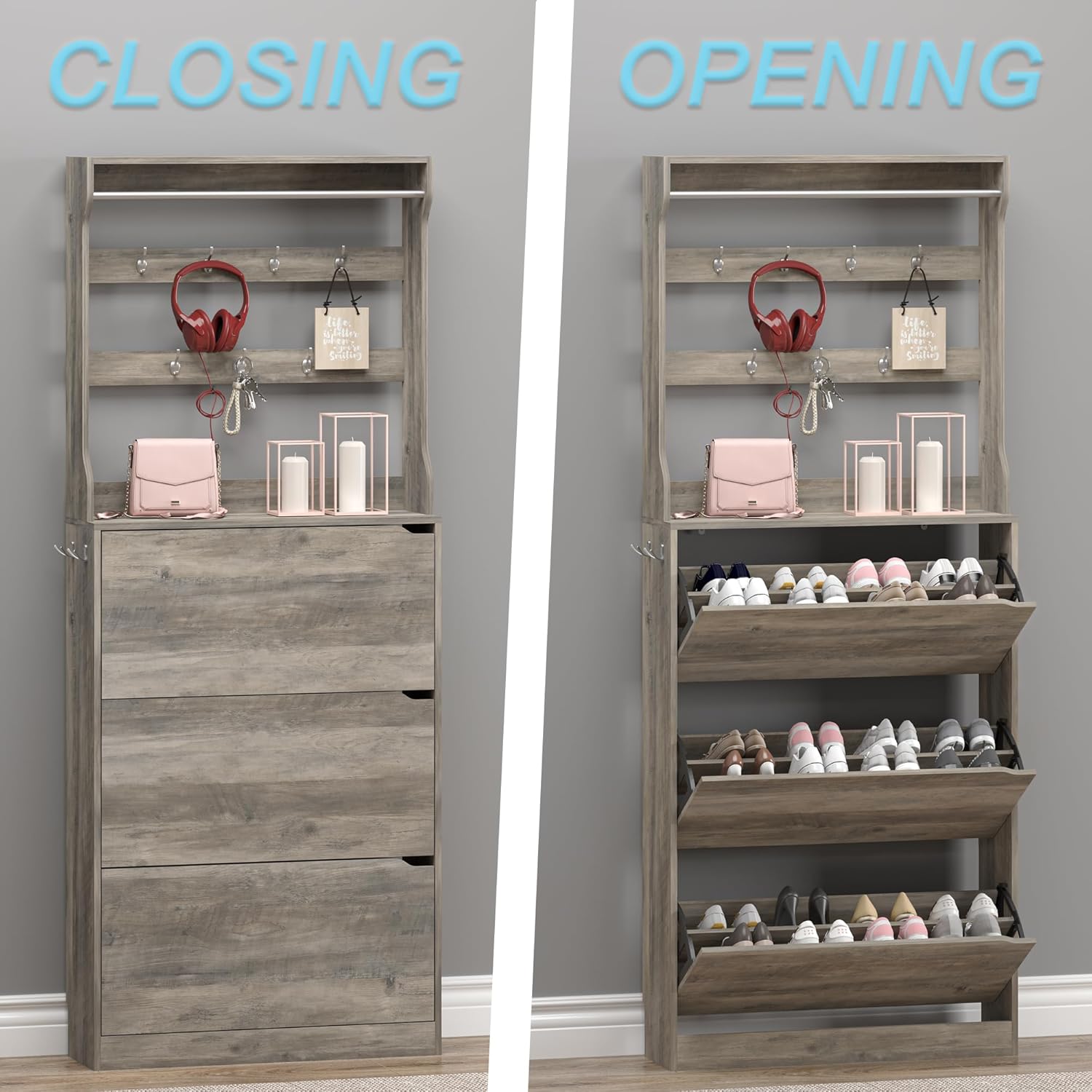 Shoe Cabinet with 3 Flip Drawers & Coat Rack, Narrow Hidden Shoe Storage Cabinet, 2-in-1 Hall Tree Slim Freestanding Shoe Rack Organizer for Entryway, Hallway, and Living Room