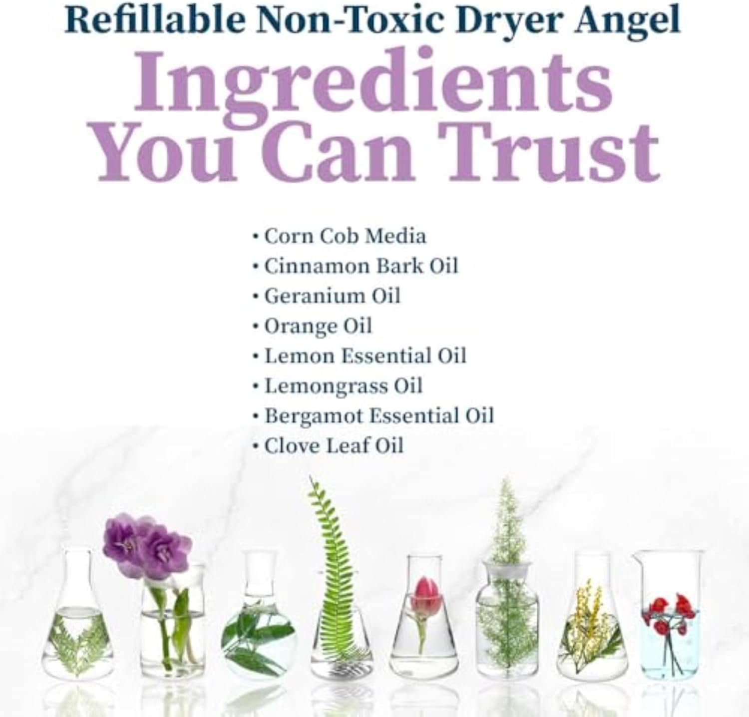 - SCENTED WITH PURE ESSENTIAL OILS: Truly Free Dryer Angel uses a blend of plant based essential oils like cinnamon bark, geranium, orange, lemon, bergamot, clove leaf, and lemongrass to impart a soft, natural scent to your laundry. This gentle fragrance is distinct but never overpowering, offering a refreshing scent for your clothes.