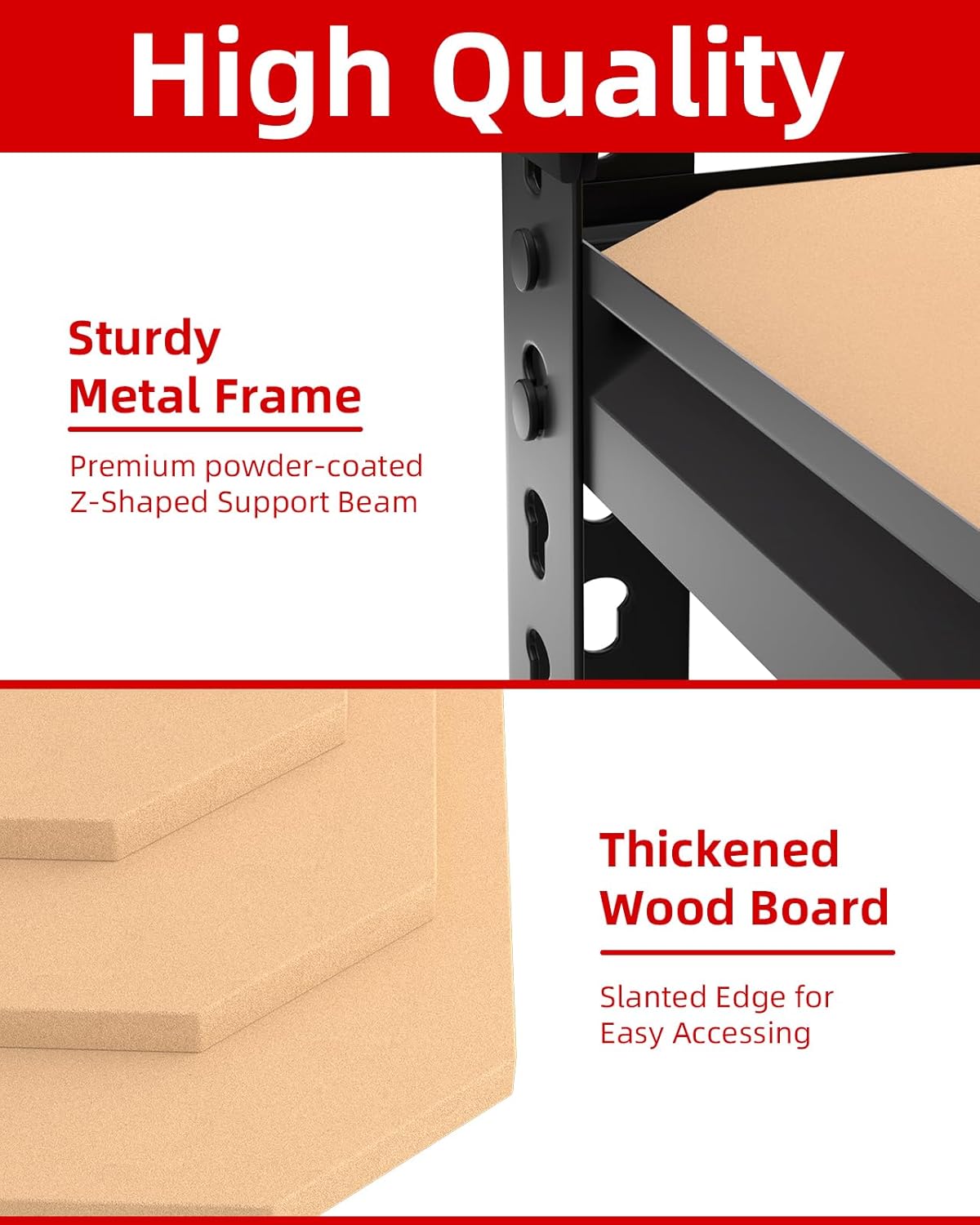 - ăHeavy Duty Garage Shelving UnităThe 5-tier heavy duty garage storage shelving unit is constructed from FSC-Certified high-quality thick MDF boards and a heavy-duty metal frame with a premium powder-coated finish surface. Each shelf layer is equipped with 1 middle support beam. It's not only sturdy and long-lasting, but also ensures the shelf maintains its appearance and performance in various environments. Each shelf holds up to 400 lbs, 5 tier shelves' total max load weight is 2000 lbs
