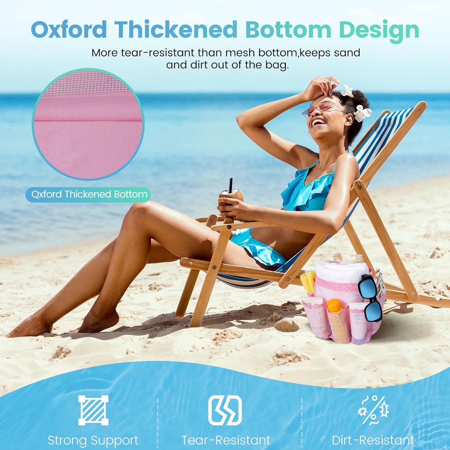 - Reinforced Oxford Base, Stronger Support:For the most essential part of this beach bag, we utilize highly strong and durable Oxford fabric for the bag base, delivering higher weight capacity, wear and tear resistance. The base supports travel essentials firmly and keeps them away from sand.