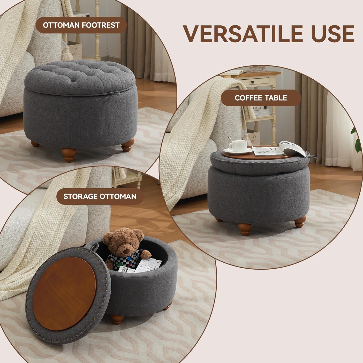 24Inch Round Storage Ottoman with Tray, Modern Tufted Fabric Circle Coffee Table with Storage, Upholstered Ottoman with Removable Top for Living Room, Bedroom, Dark Grey