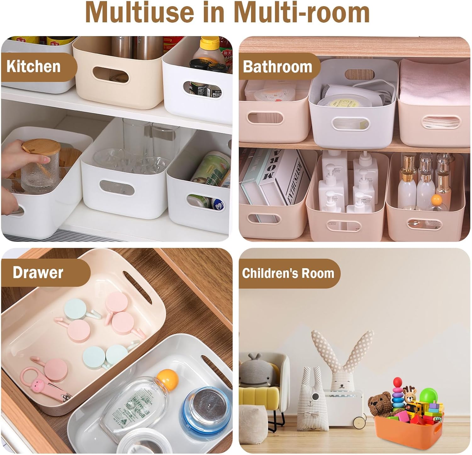 - Wide Application: These storage bins are ideal for use in a variety of settings, including bathrooms, bedrooms, kitchens, living rooms, studies, and offices, providing an efficient way to organize and declutter your space.