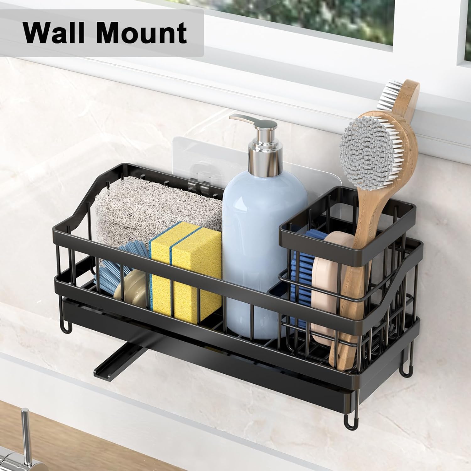 Sponge Holder for Kitchen Sink, Sink Caddy with High Brush Holder, Rustproof and Strong, anti slip, Self Draining spout is ideal, Keep Countertop Cleaning, Black