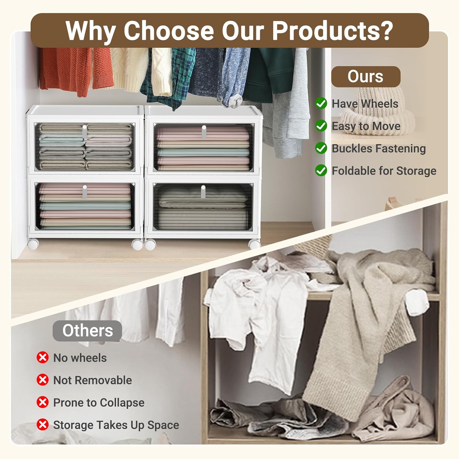 Storage Bins with Lids,4 Tier Stackable Storage Bins with Drawers,4 Pack Collapsible Plastic Storage Boxes with Wheel-1 Lid,23QT Foldable Containers for Closet Living Room Bedroom Office.
