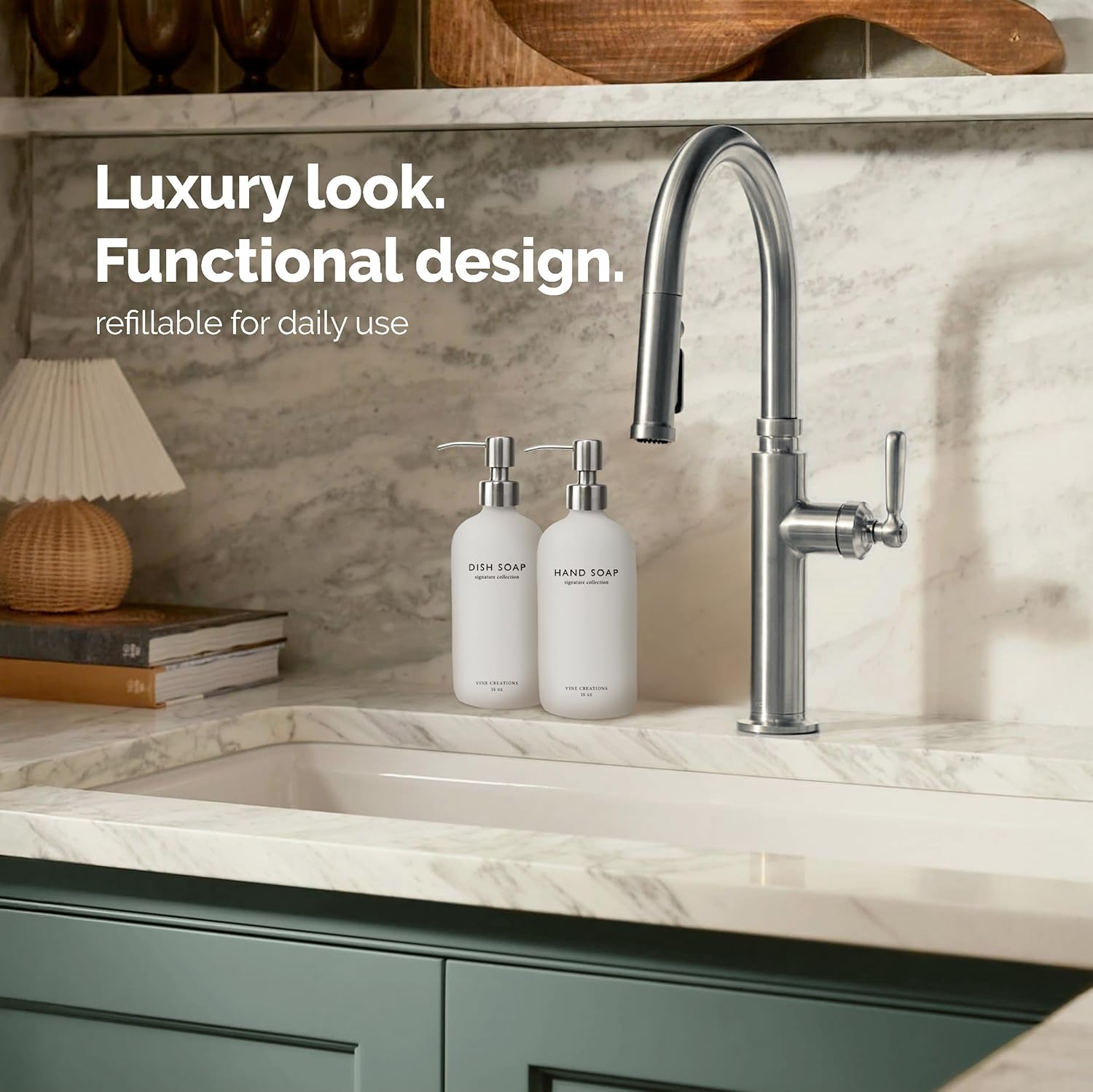 - STYLE YOU CAN FEEL β Heavier than standard dispensers, this hand and dish soap dispenser set of 2 brings substance and sophistication to your countertop. Built to last and made to impress.