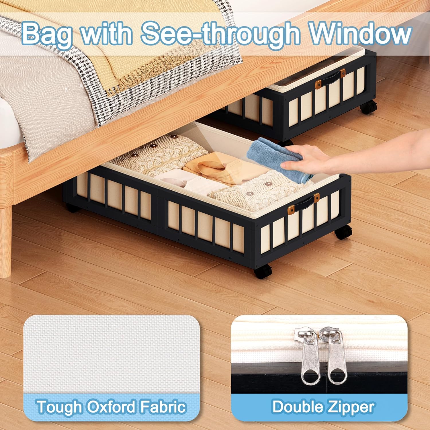 efluky 2-Pack Bamboo Under Bed Storage Containers with Wheels, Under Bed Clothes Storage Basket with Large Dust Bag, Rolling UnderBed Storage for Bedroom, Dorm and Basement, Black
