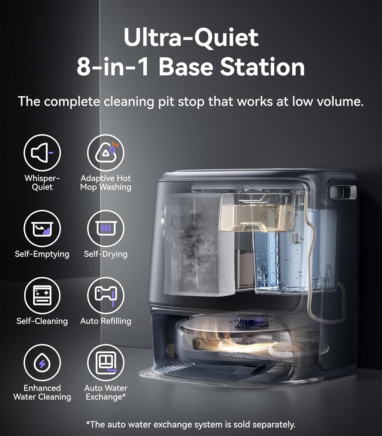 - Special Feature : Robot Vacuum and Mop Combo, AI-Powered Obstacle Avoidance, Precision Navigation, MopExtend & EdgeSwing, Corner Reverse Cleaning, Powerful 18,000Pa Suction, Revolutionary DualFlow Tangle-Free System, Carpet Cleaning, Adaptive Hot-Water Self Wash & Self Emptying, Real-Time Adaptive Cleaning, Low Noise, Smart Pet Mode, App Control, Voice Assistant, Works with Alexa Robot Vacuum and Mop Combo, AI-Powered Obstacle Avoidance, Precision Navigation, MopExtend & EdgeSwing, Corner Reverse… See more