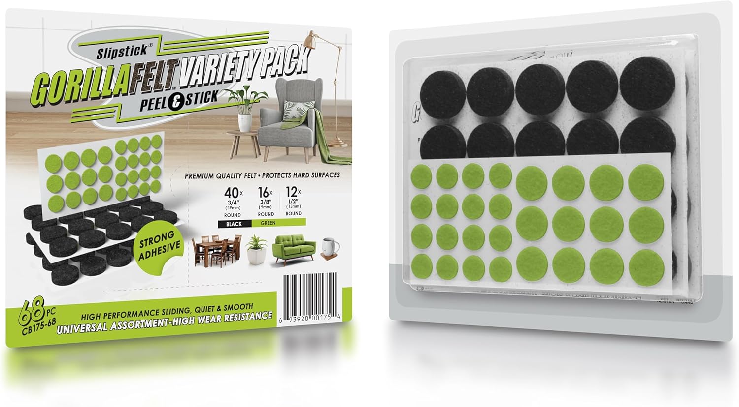 - 68 Piece felt pad combo pack– This combo pack of Gorilla Felt floor protectors includes (40) ¾” round black felt pads for furniture as well as (16) 3/8” round and (12) ½” round green felt pad surface protectors for décor and small items.