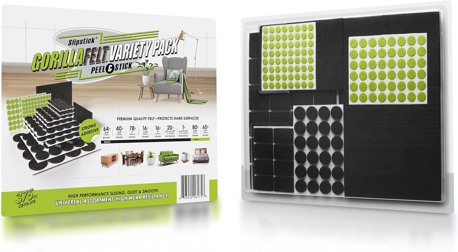 - 375 Piece felt pad variety pack of multiple shapes and sizes β This huge variety pack of Gorilla Felt floor protectors includes (64) 3/8β round, (40) 3/4β round, (78) 1β round, (16) 1-1/2β round, (16) 2β round, (20) 1/2β x 2-1/2β rectangle, (1) 4-1/3β x 6β rectangle black felt pads for furniture as well as (80) 3/8β round and (60) Β½β round green felt pad surface protectors for dΓ©cor and items.