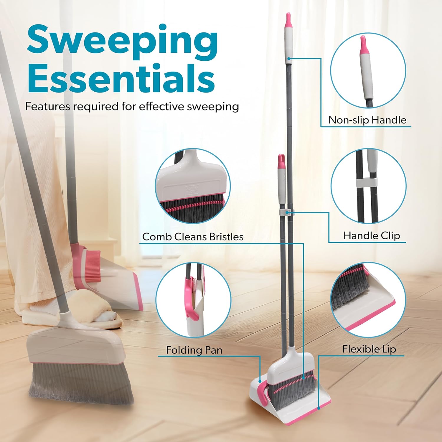- Self Cleaning Comb Design - Sturdy teeth at the top of the dustpan comb the broom, when it collects hair/dust/lint which usually gets tangled into the bristles. Otherwise, you would need to remove them manually - not the most pleasant experience. The dustpan has a rubber lip and seamlessly sticks to the floor. It picks up everything, including the smallest particles, in the first swoop, so you will finally spend less time cleaning - more time living!