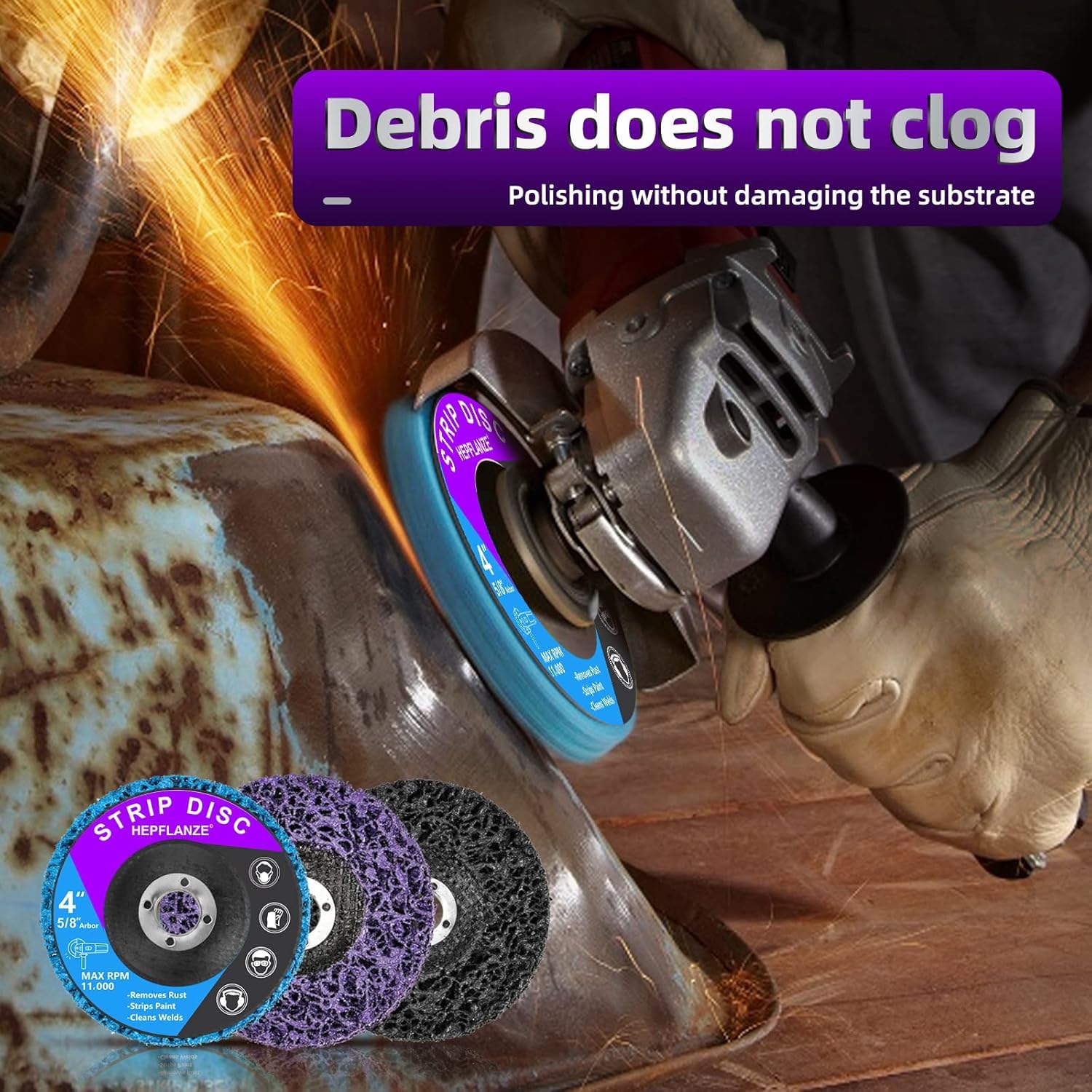 - 【FUNCTION】Stripping wheels are a safer alternative to wire brushes. Strip discs feature silicon carbide abrasive minerals incorporated into an open nylon web. It removes rust, paint, mill scale, coatings, and adhesives effectively from surfaces without significantly altering the base material.