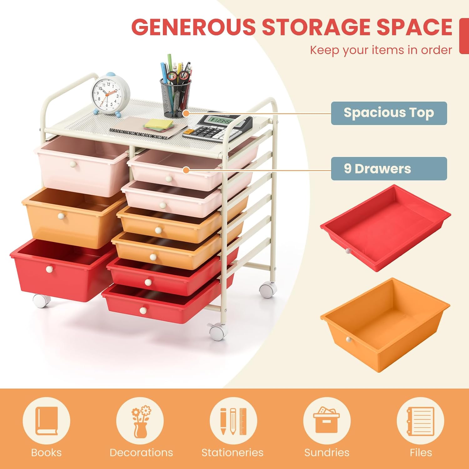 GOFLAME 9-Drawer Rolling Storage Cart, Mobile Utility Cart with Removable Drawers & Metal Frame, Art Craft Organizer Cart with Lockable Wheels, Storage Drawer Cart for Home Office, Macaron Color
