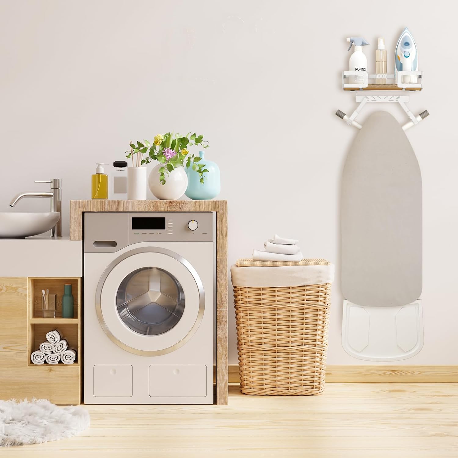 - WIDENED FRAME IS MORE STRONG: The laundry room accessories white ironing board are made of iron and natural wood. The wider frame makes it more sturdy and durable with 2 wider hooks. It creates a rustic and modern style while keeping your storage items safe.