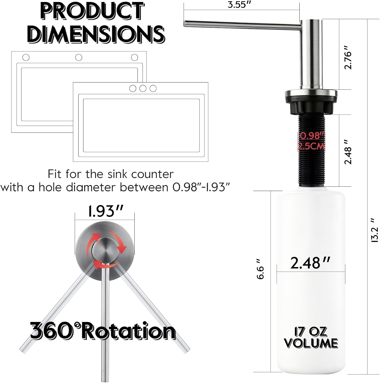 - [Stainless Steel Kitchen Sink Soap Dispenser] Crafted with commercial grade 304 stainless steel, this kitchen sink soap dispenser resists corrosion, rust, and fingerprints while ensuring durability against daily exposure to water and cleaning agents. The solid metal construction maintains a sleek appearance and complements modern sink fixtures