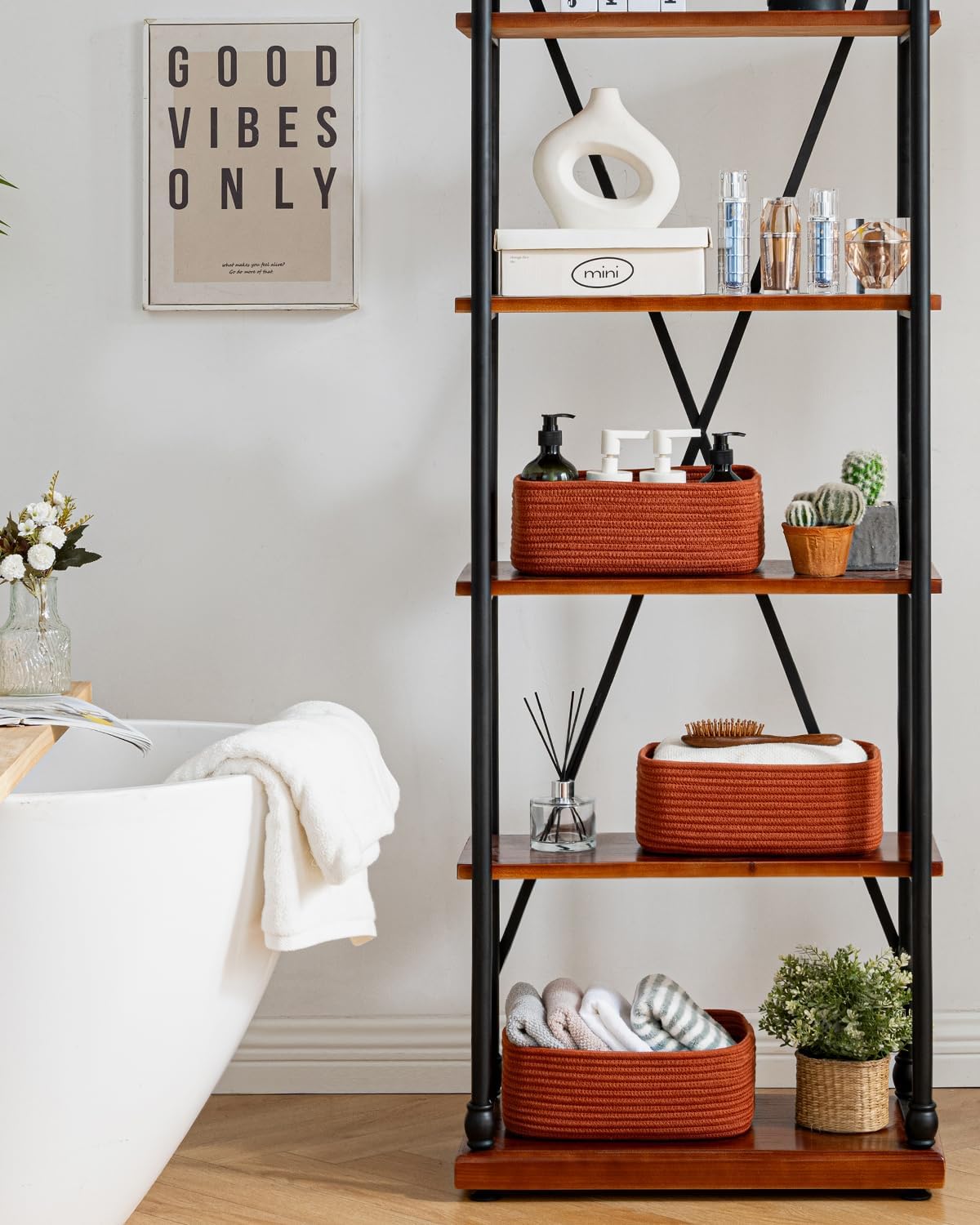 - [ Elegantly Designed to Match Any DΓ©cor ] Our small rope basket creates a minimalist appearance, and it adds a touch of warmth and texture to any room. The classic solid color design ensures seamless integration with your existing aesthetics, complementing any decoration. Perfect as decorative storage baskets for shelves, cabinets, and any open display space, making them a stylish and practical addition to any decor, enhancing the overall aesthetics of your room