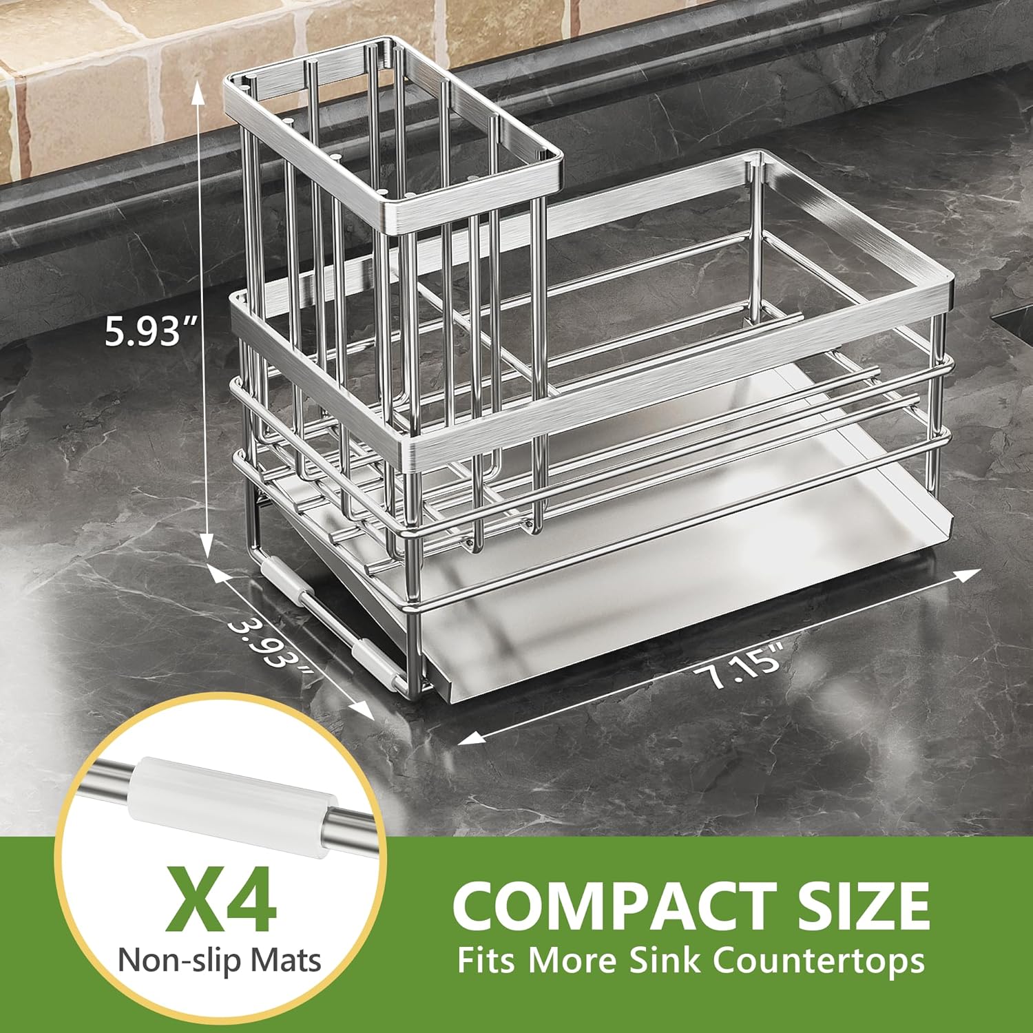 - COMPACT STRUCTURE: Measuring 7.15" x 3.93" x 5.93", this sink sponge holder is suitable for narrow spaces on your countertop while providing ample storage space. It can neatly accommodate your cleaning essentials, helping to keep your kitchen organized. Store all your cleaning supplies with this space-saving sink caddy!