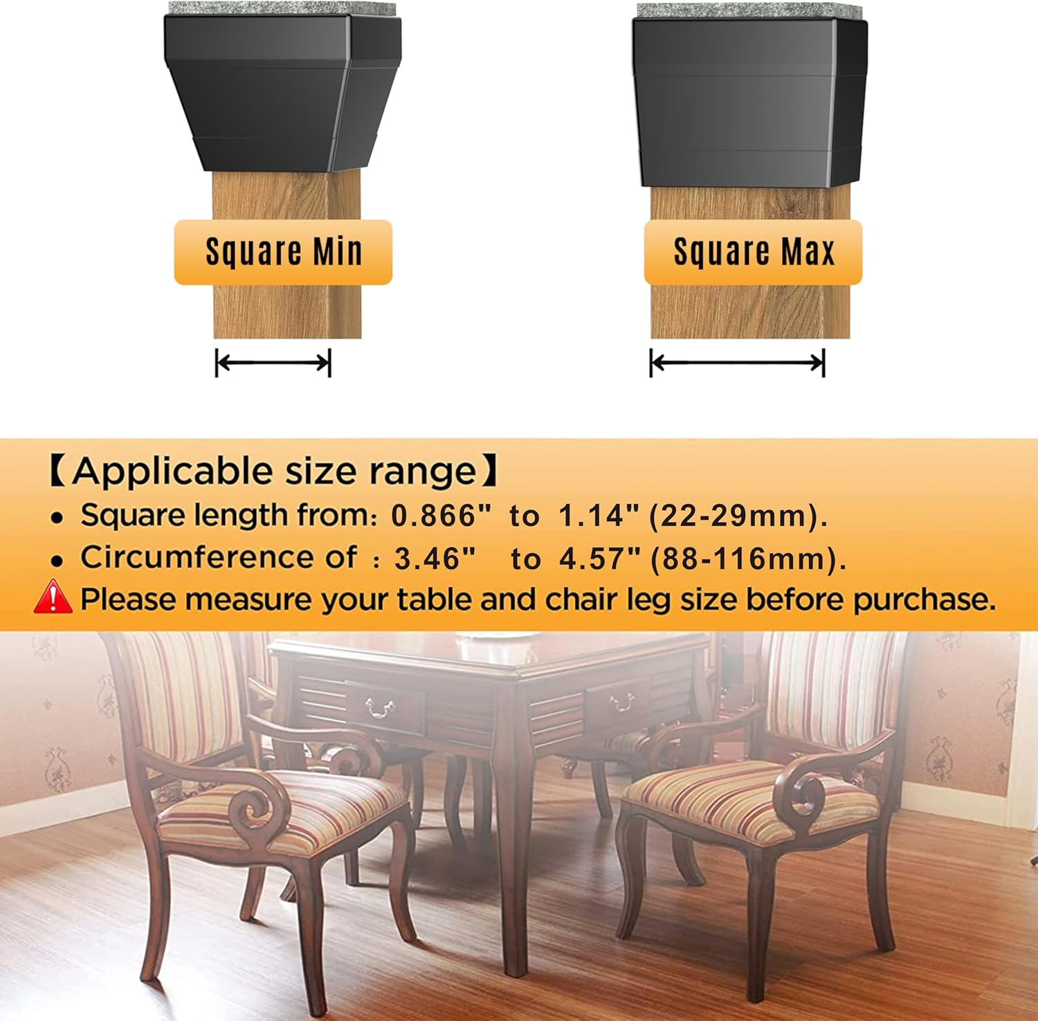 - Universal Fit: Suitable for chair legs with perimeter of 3.46" to 4.57" (88-116mm). Square length 0.866" to 1.14" (22-29mm). Please measure the diameter of your furniture legs before purchasing. Our chair leg caps are suitable for square furniture foot , such as restaurant chairs, bar stools, patio chairs, kitchen chairs, storage cabinet, metal bistro chairs etcchair etc.