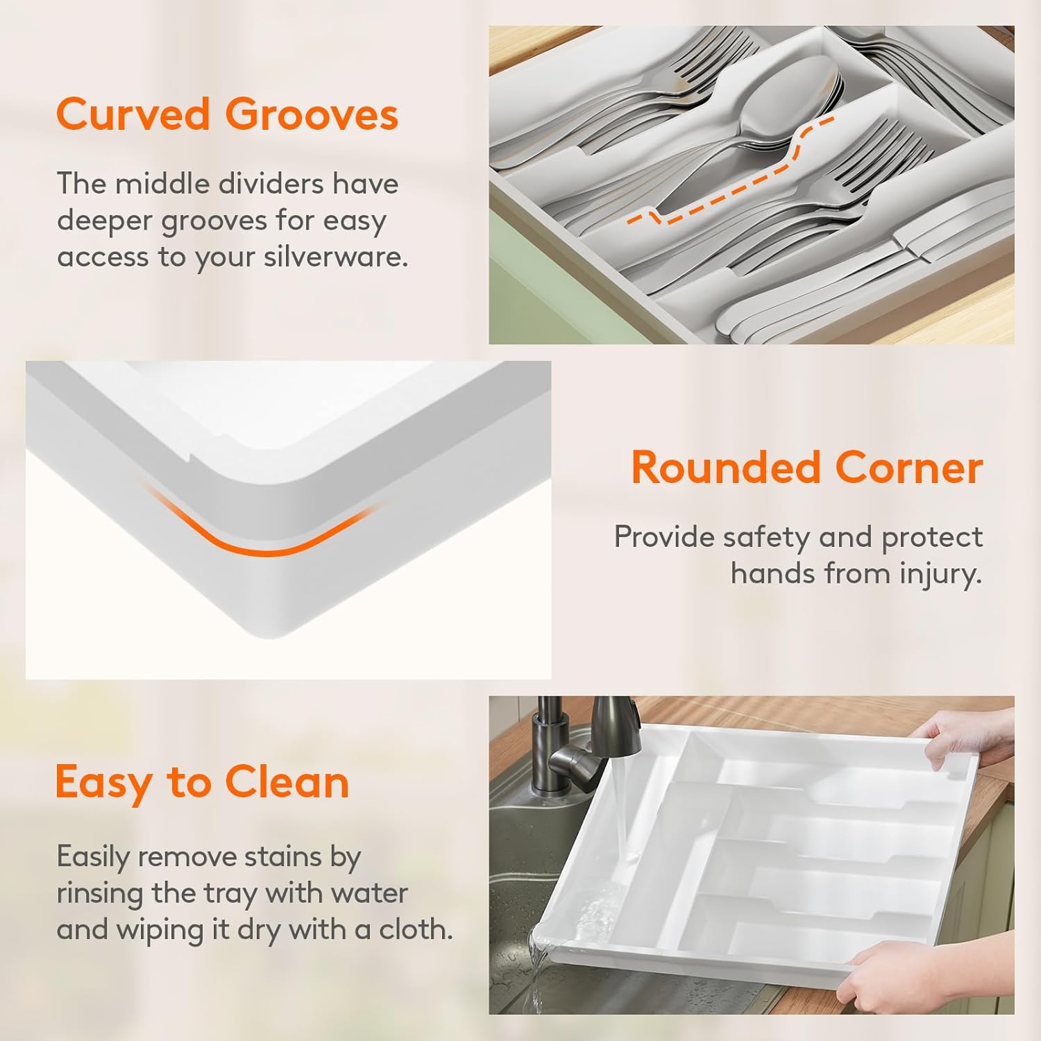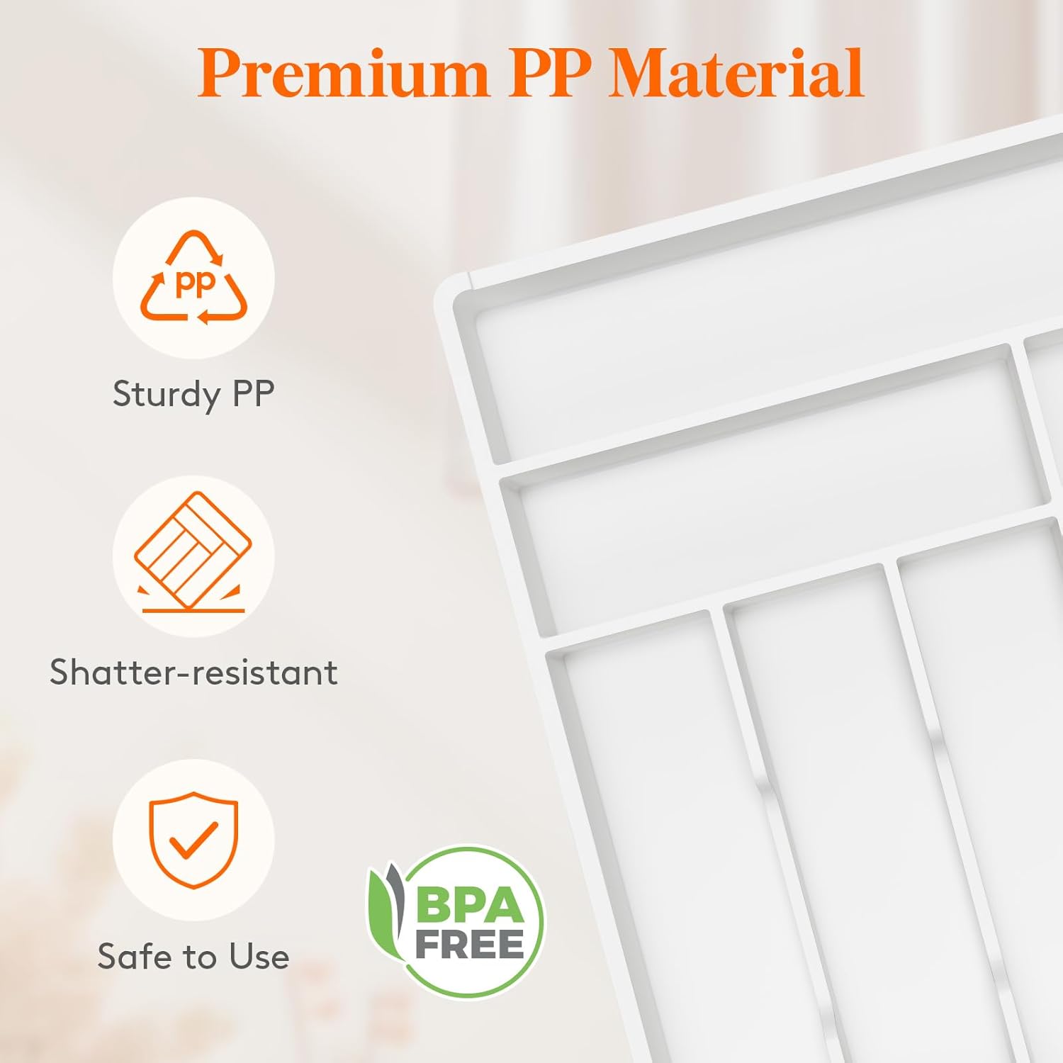- Robust and Safe: This kitchen drawer organizer is crafted from premium PP material, BPA-free and built to last. It ensures your silverware is stored in a healthy, safe environment for worry-free use