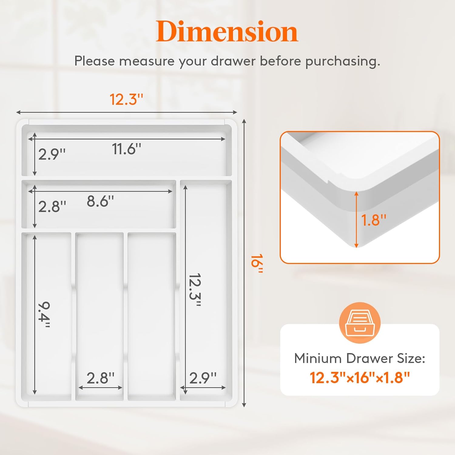 - Fit Most Drawers: Measuring 12.3" Ă— 16" Ă— 1.8" (31.3 Ă— 40.7 Ă— 4.6 cm), the Lifewit silverware organizer easily fits in most standard and small-sized drawers. This universal utensil drawer organizer helps you maximize storage space efficiently while keeping your utensils neatly organized and easily accessible