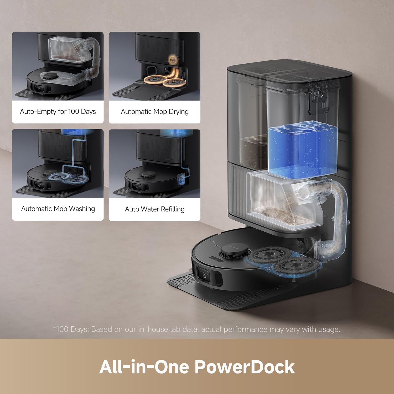 - All-in-One Self-Emptying Base: The robot vacuum self emptying PowerDock station automates maintenance by refilling water, washing mopping pads, and providing hot air drying. As a self-emptying robot vacuum, it holds up to 100 days of dust, offering a truly hands-free cleaning experience.