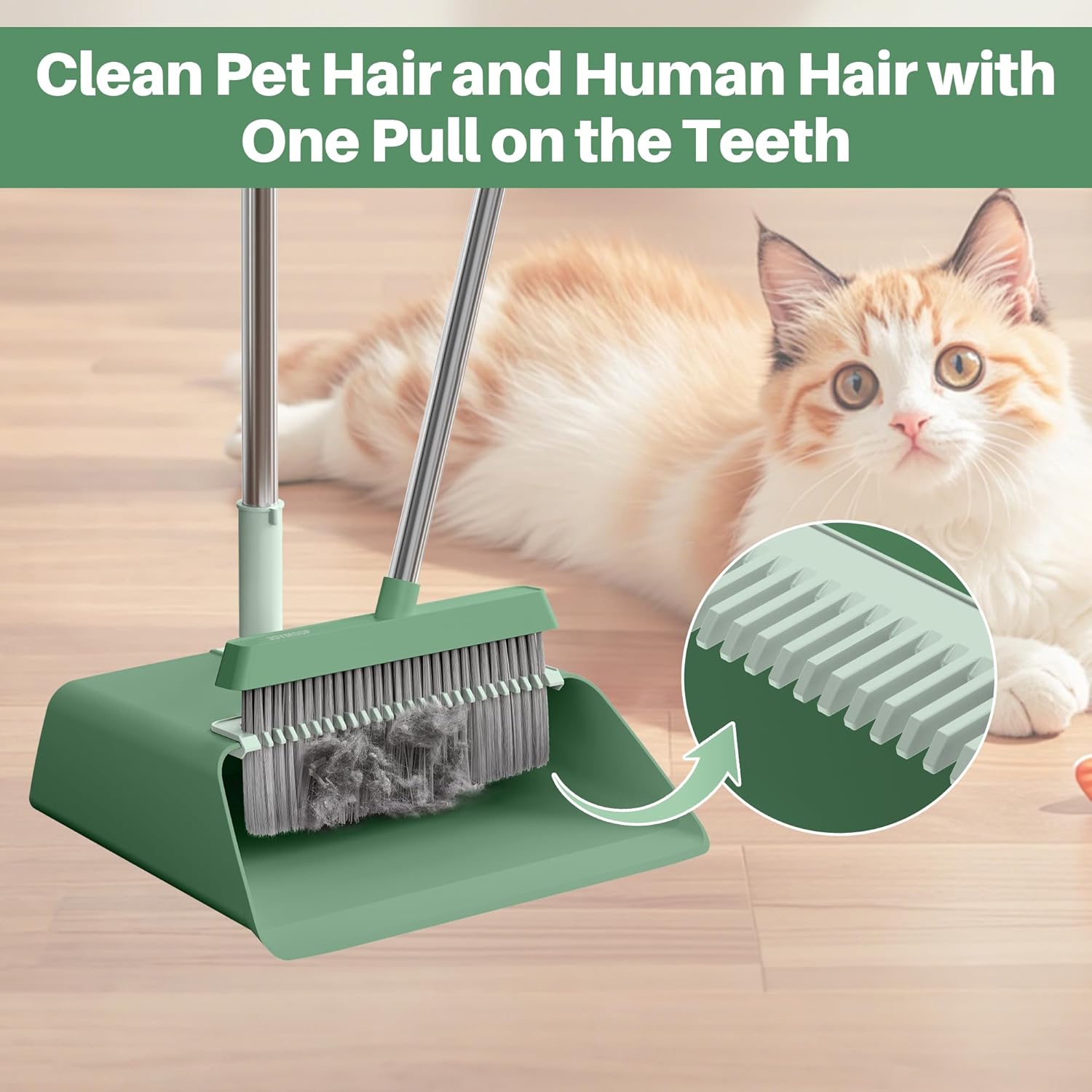 JOYMOOP Dark Teal Green Broom and Dustpan Set, Upright Angle with Built-in Comb Teeth, Ideal for Home, Office, Hardwood, Pet Hair