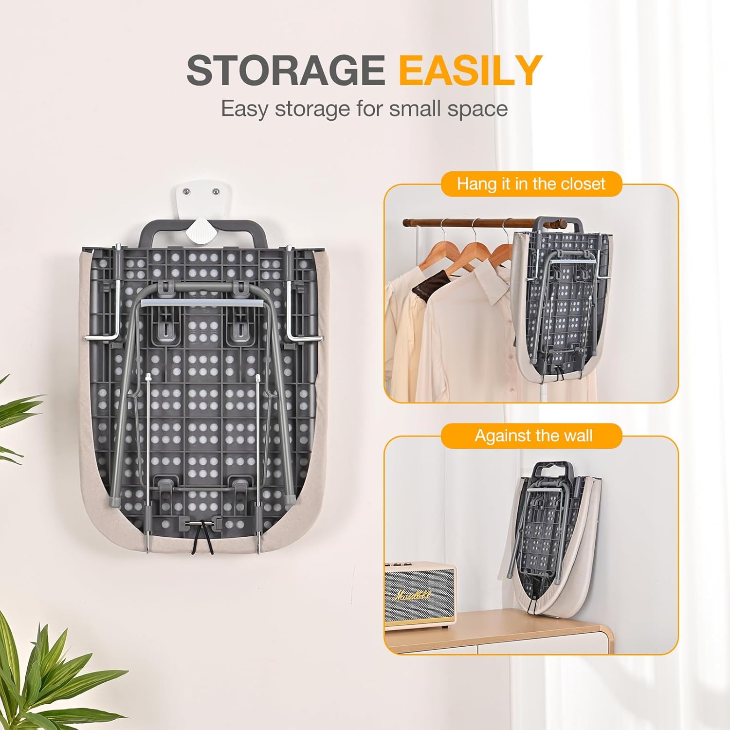 - Amazing Space-Saving: Space-saving compact iron board with its own hanging hook, easily hangs over any standard door, also can storage in a closet, against a wall, even can under couch or bed. Handle design is easy to carry wherever you needed