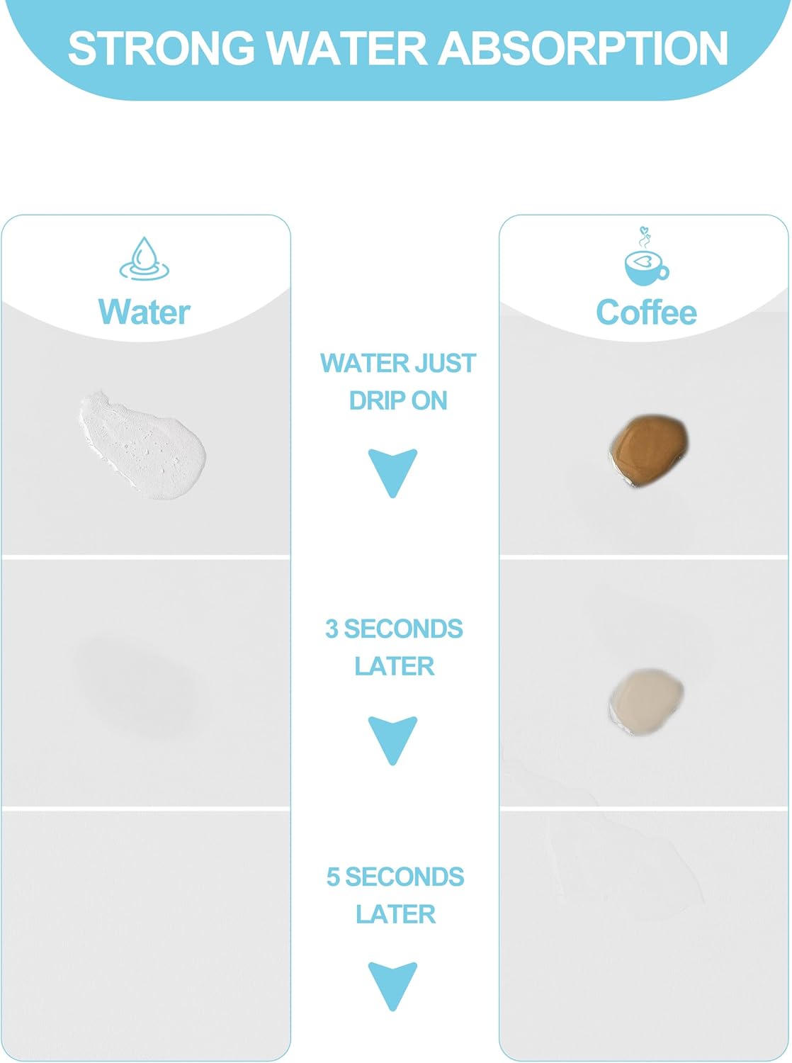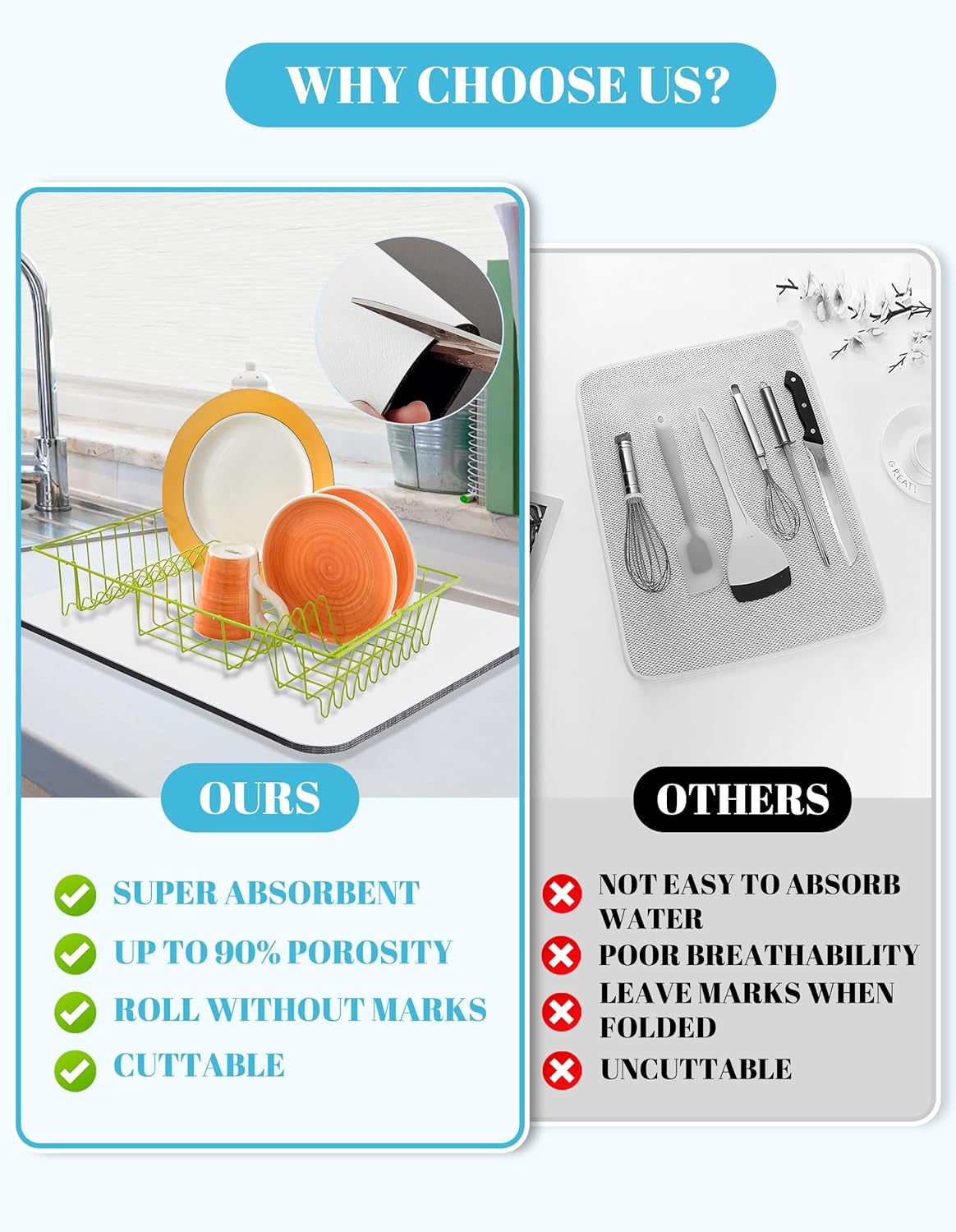 - Super Absorbent: Dish Drying Pad is made of super absorbent nano, the drying pad is soft and highly absorbent, which can dry quickly. In addition, the drying mat is thick enough to better protect countertops, tableware, and glassware from damage and contamination.