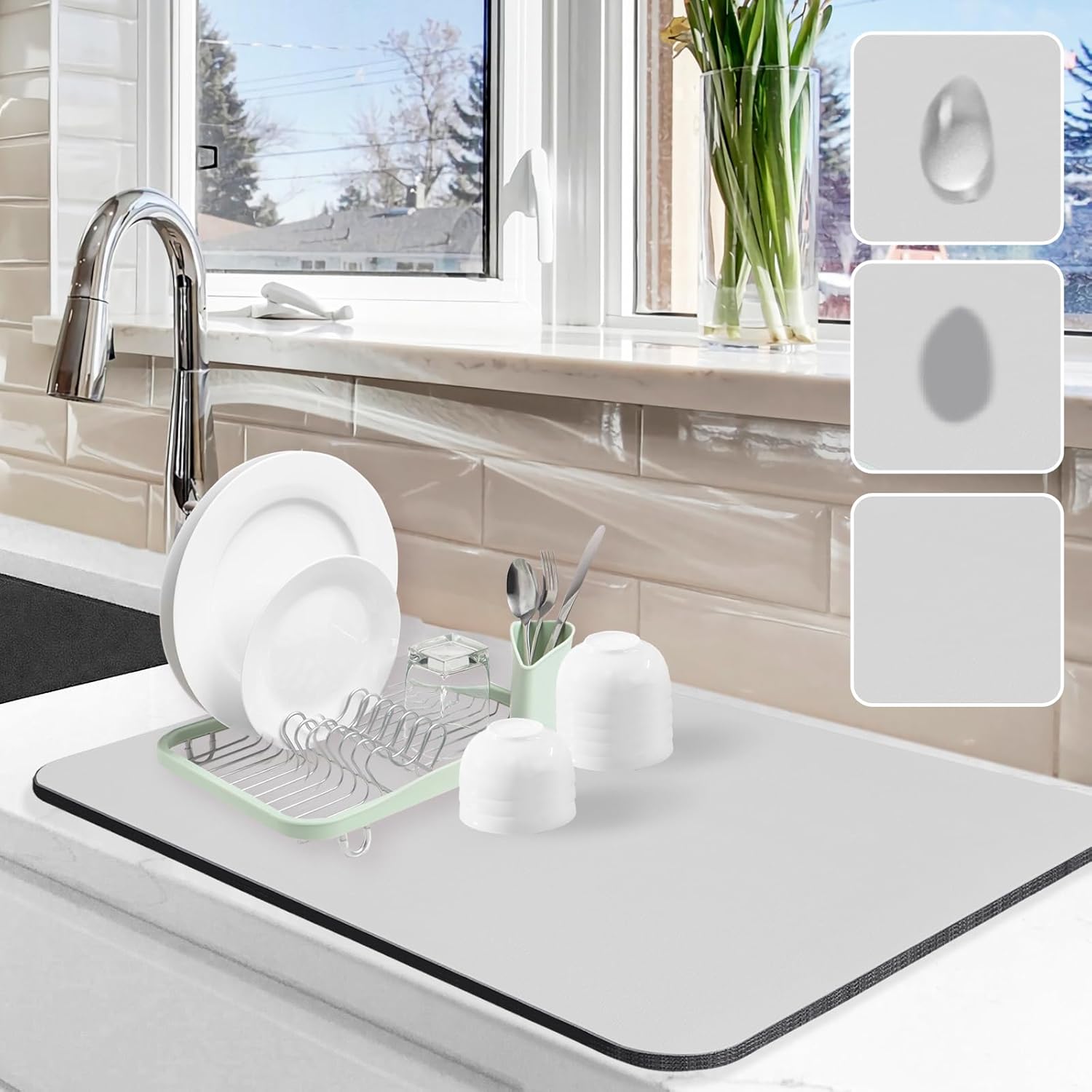 Dish Drying Mat for Kitchen Counter, 16"x24" Dish Drying Pad with Non-slip Rubber Backed, Hide Stain Anti Absorbent for Kitchen Counter, Drying Mat for Coffee Machine Dish Rack (Light Grey)