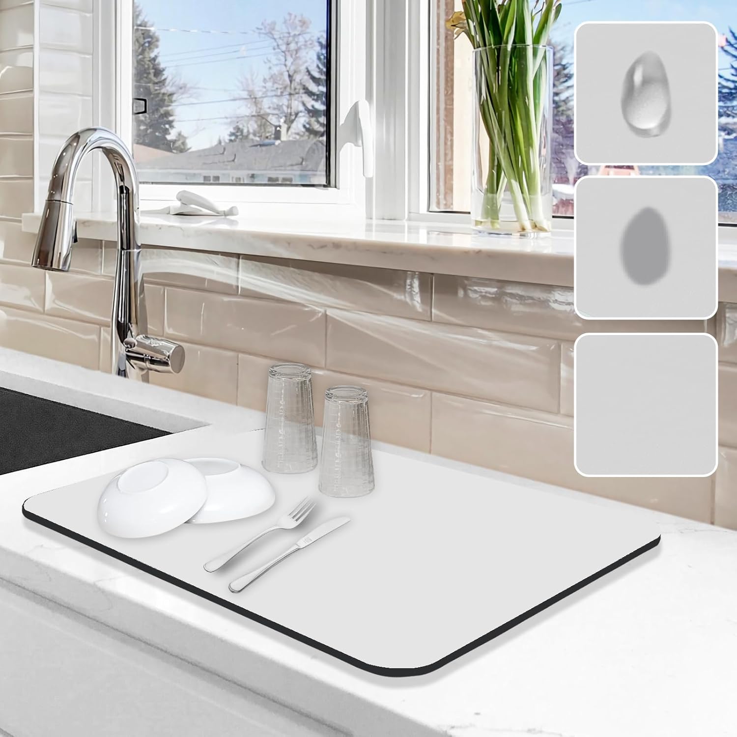 - Super Absorbent: Dish Drying Pad is made of super absorbent nano, the drying pad is soft and highly absorbent, which can dry quickly. In addition, the drying mat is thick enough to better protect countertops, tableware, and glassware from damage and contamination.