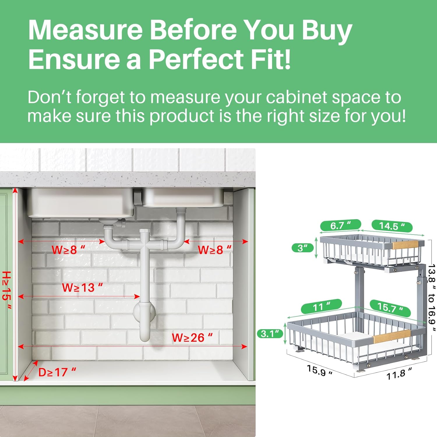 • Larger Organizer for Maximum Efficiency: This under sink organizer, measuring 11.8"W x 15.9"D x (13.8"-16.9")H, providing more capacity for storing taller bottles, cleaning supplies and other essentials.Before purchasing, please double-check your cabinet dimensions to ensure this under cabinet organizer fits properly.