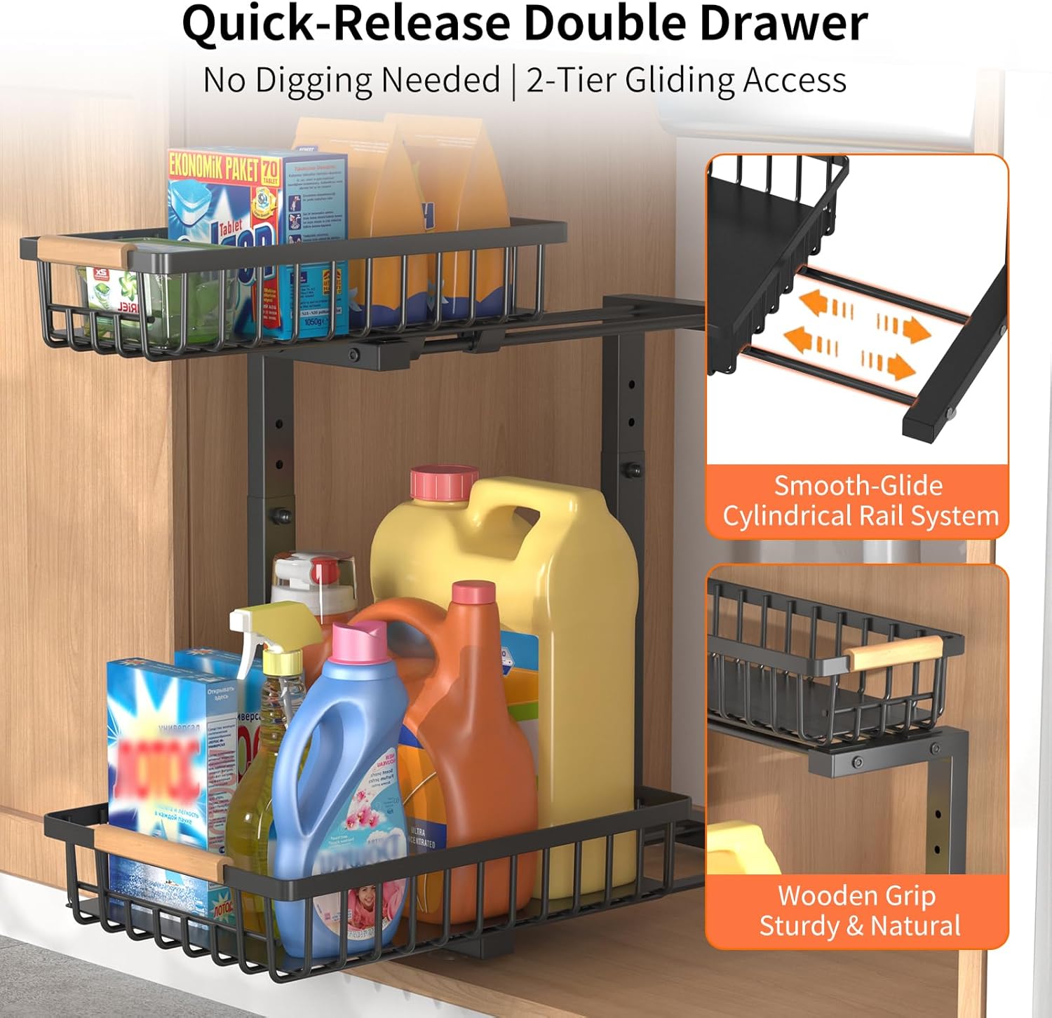 - 【Smooth-Gliding Storage System】 This under the sink organizer with 2-tier pull-out drawers transform cluttered spaces. Effortless-access undersink storage solution holds cleaning supplies & toiletries.