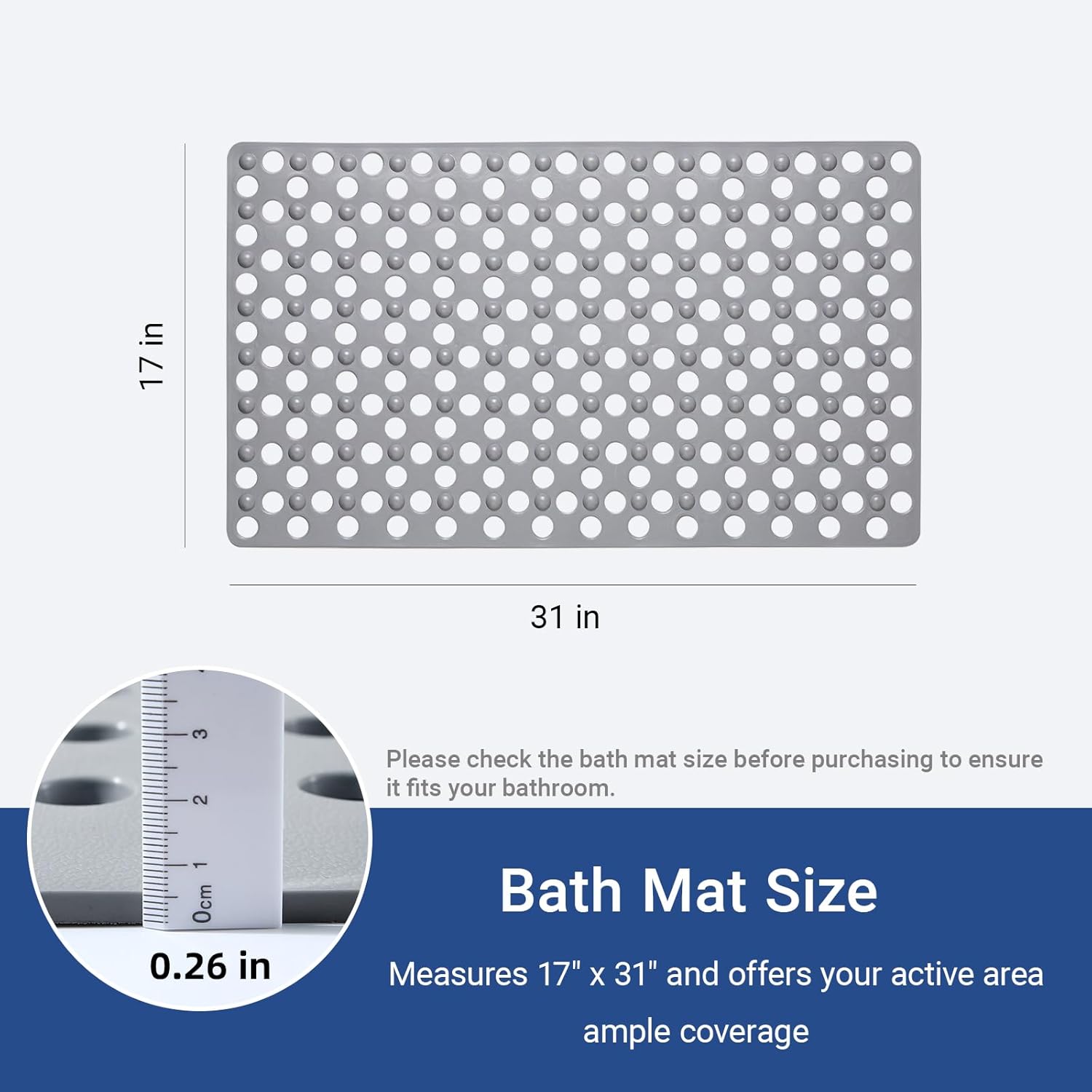 Non Slip Bathtub Mat and Shower Mat 31x17 inch,Bath Mat with Quick Dry Drain Holes and Suction Cups, Soft Comfortable Safe Bathroom Mat for Bath Tub, Floor, Tile (Grey)