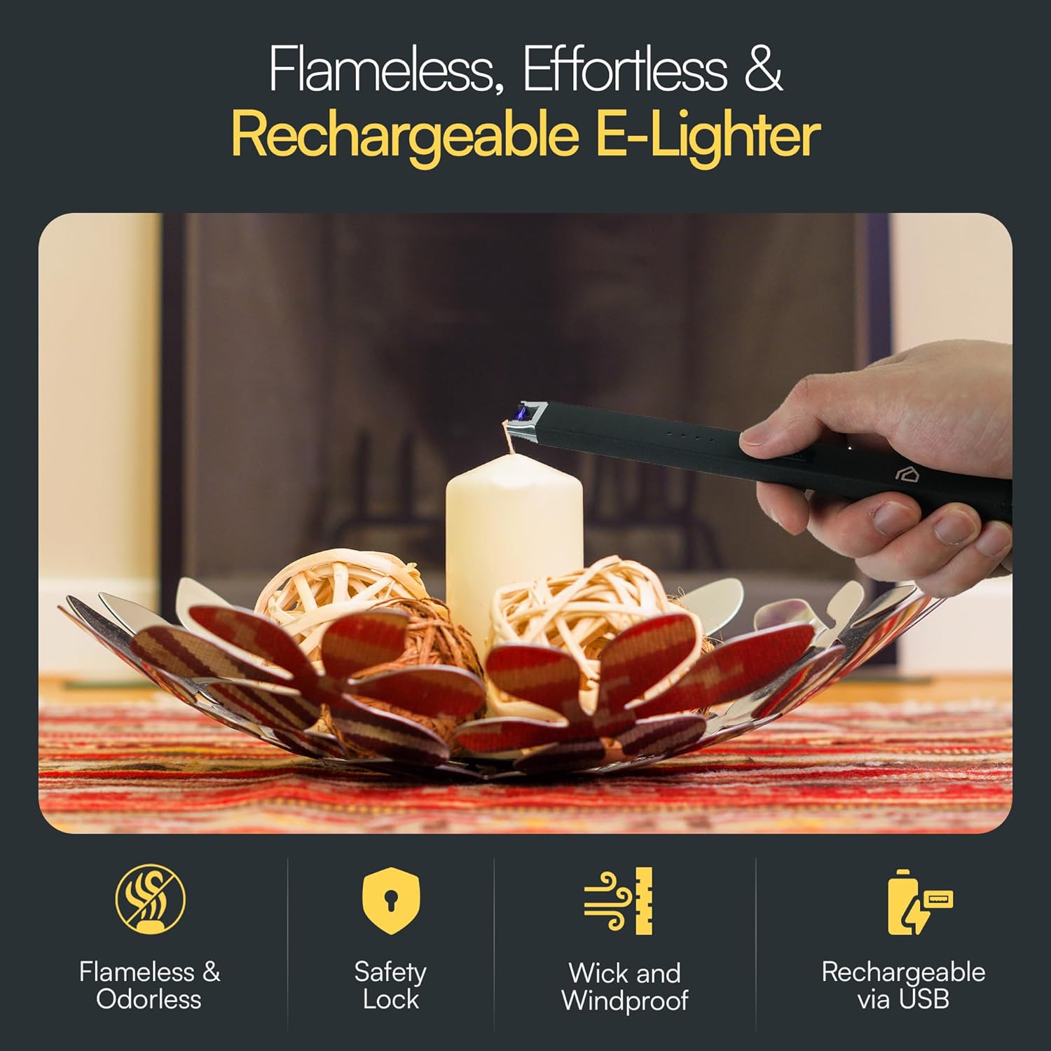 - ✅ Rechargeable Candle Lighter Included. Eco-friendly, flameless e-lighter with a durable battery lights candles easily, safely, and without matches.