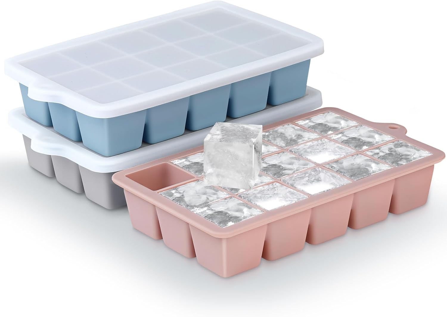 Silicone Ice Cube Trays 3Packs, Easy Release Ice Cube Molds with Lid, Freezer Stackable Ice Maker for Whiskey, Baby Food, BPA Free (Blue+Grey+Pink)