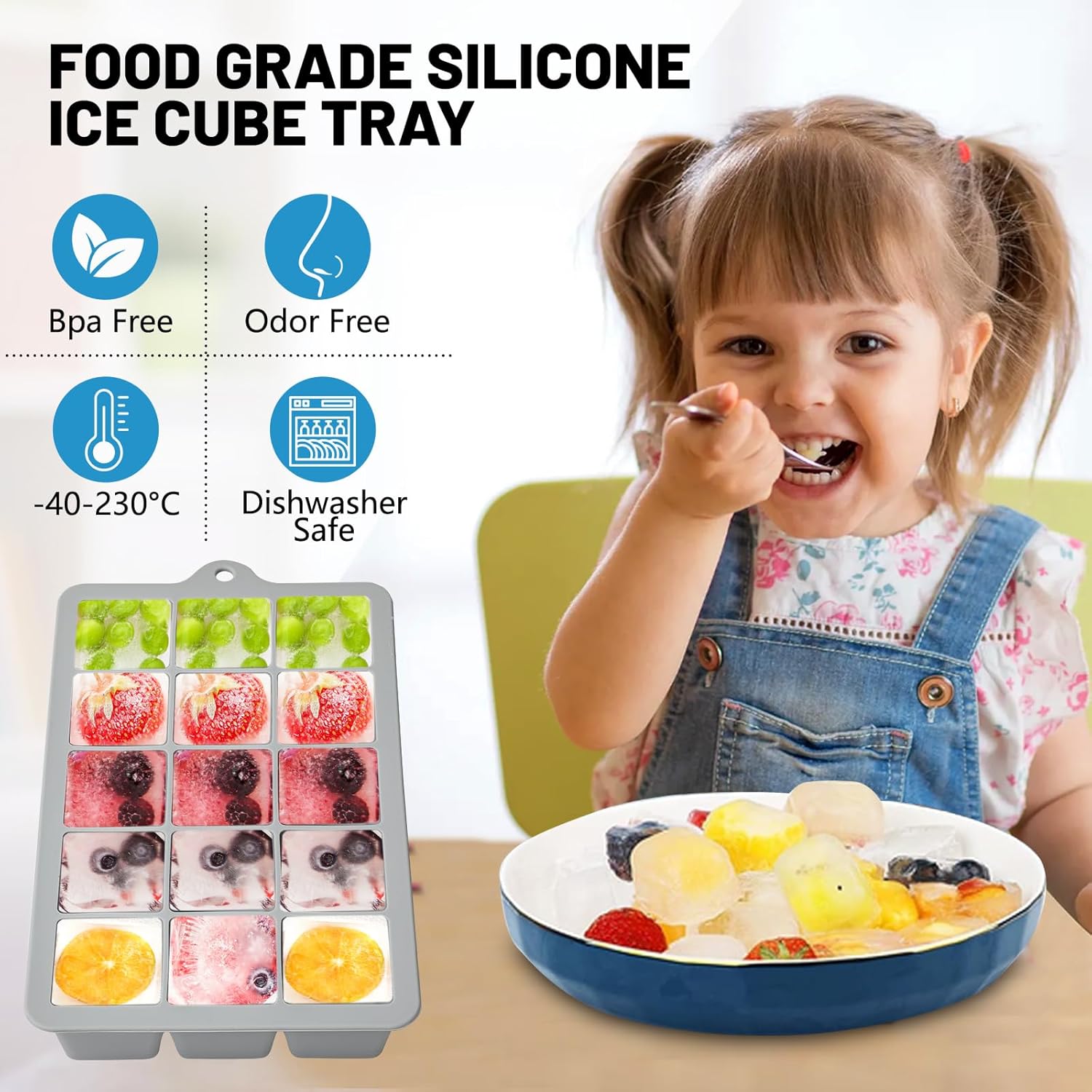 - Silicone Ice Cube Tray; Made of food grade silicone which is safe, soft and odorless, they can directly contact food. they can withstand long-term low-temperature storage and high-temperature heating, can be used in refrigerator, freezer and microwave, oven